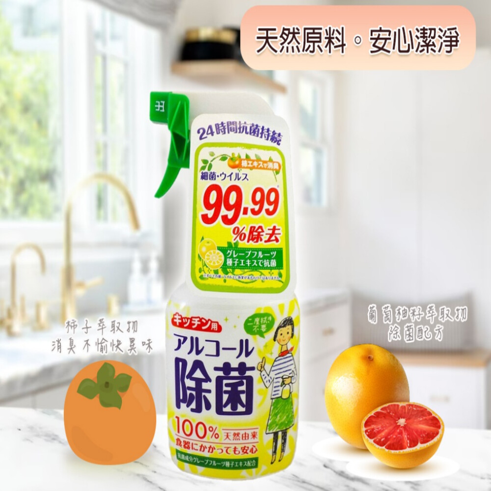 日本獅子化學 PIX 廚房酒精除菌消臭噴霧 400mL,以天然萃取成分為基底,快速除菌消臭,連食器都能安心使用。