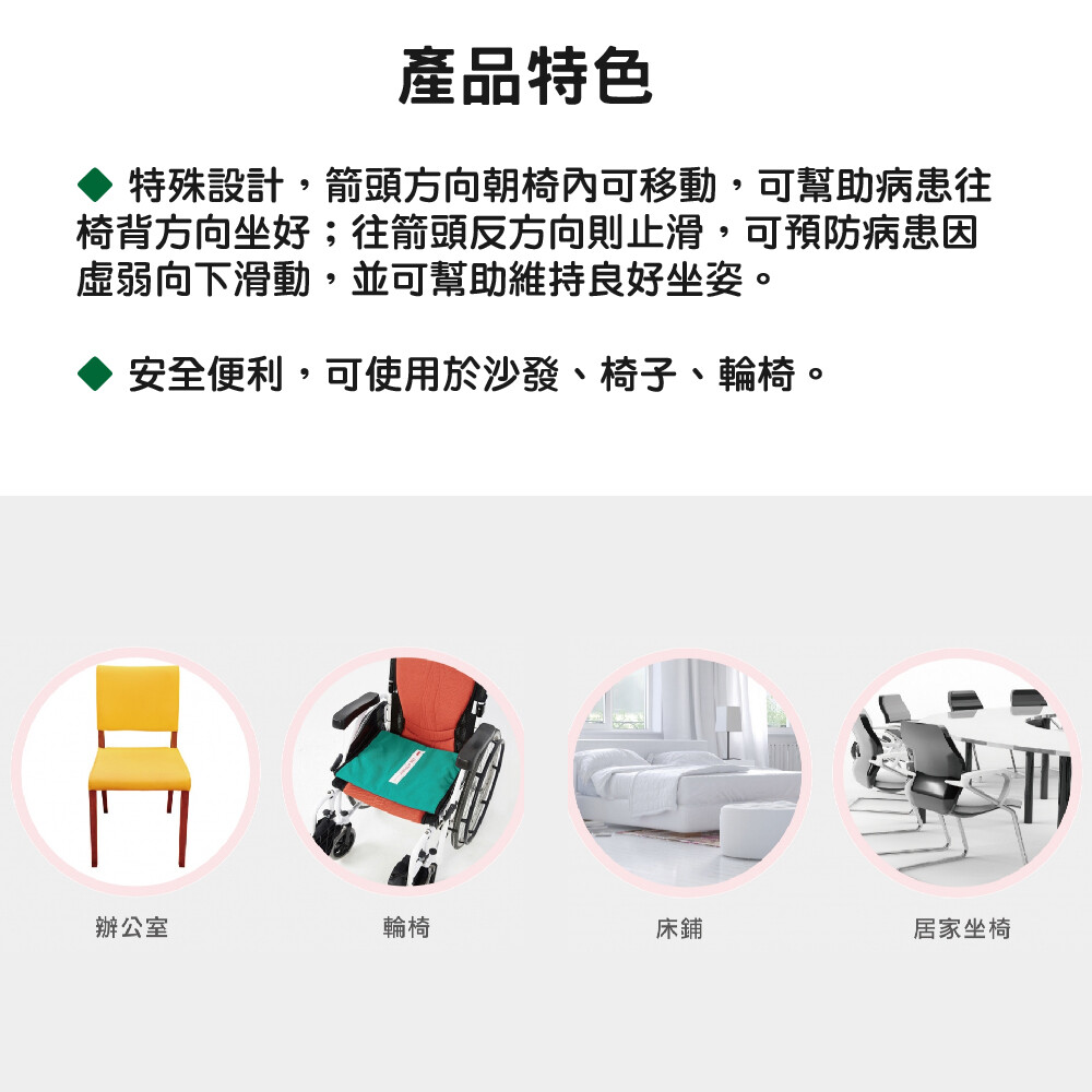 反則止滑,可預防病患因虛弱向下滑動,並可幫助維持良好坐姿,安全便利,可使用於沙發、椅子、輪椅。