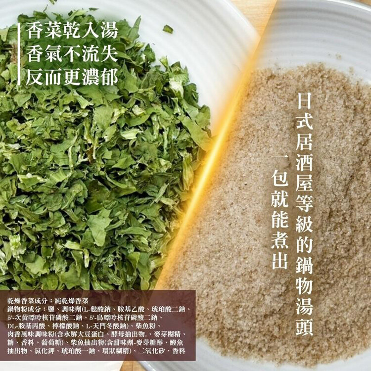 ※鍋物粉:鹽、調味劑(L-麩酸鈉、胺基乙酸、琥珀酸二鈉、5'次黃嘌呤核苷磷酸二鈉、5'鳥嘌呤核苷磷酸二鈉、DL-胺基丙酸、檸檬酸鈉、L-天門冬酸鈉)、柴魚粉、肉香風味調味粉(含水解大豆蛋白、酵母抽出物.、麥芽糊精、糖、香料、葡萄糖)、柴魚抽出物(含甜味劑-麥芽糖醇、鰹魚抽出物、氯化鉀、琥珀酸一鈉、環狀糊精)、二氧化矽、香料