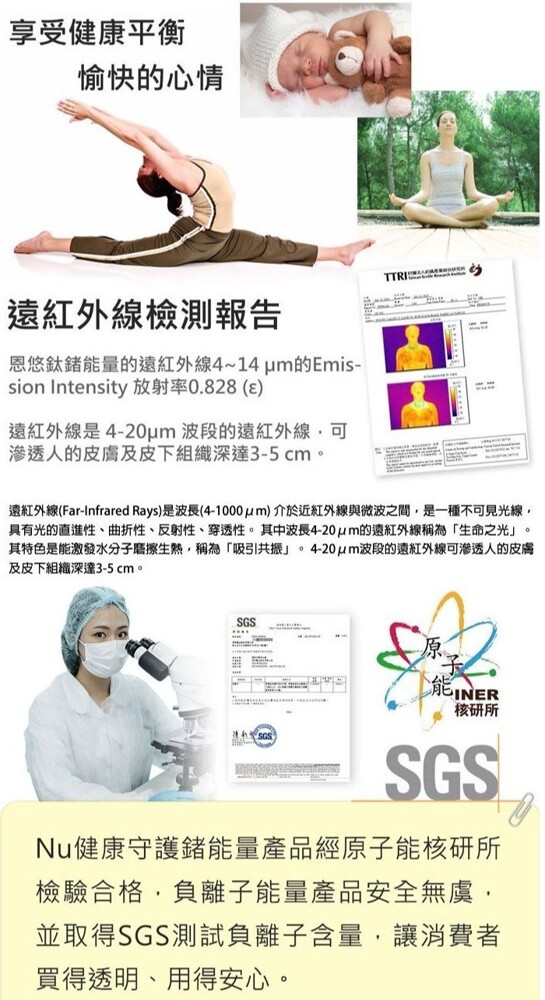 ◆ 獨家開發將五合一能量粉與膠結合 將多種稀有天然微量元素礦石覆於毯子表層 可同時經由毯子與人體體溫產生反應 形成穩定且長效的自然能量保護 同時釋放負離子、鈦、鍺、遠紅外線、電氣石等五合一能量 幫助提升人體溫度