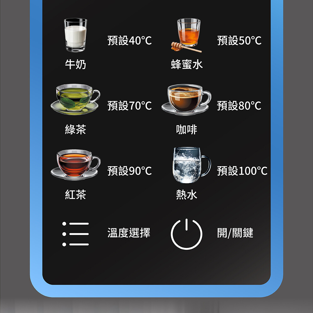 .六段智慧溫度設定(40/50/80/90/95/100℃),精準控制奶粉、花茶、咖啡、烏龍茶所需溫度