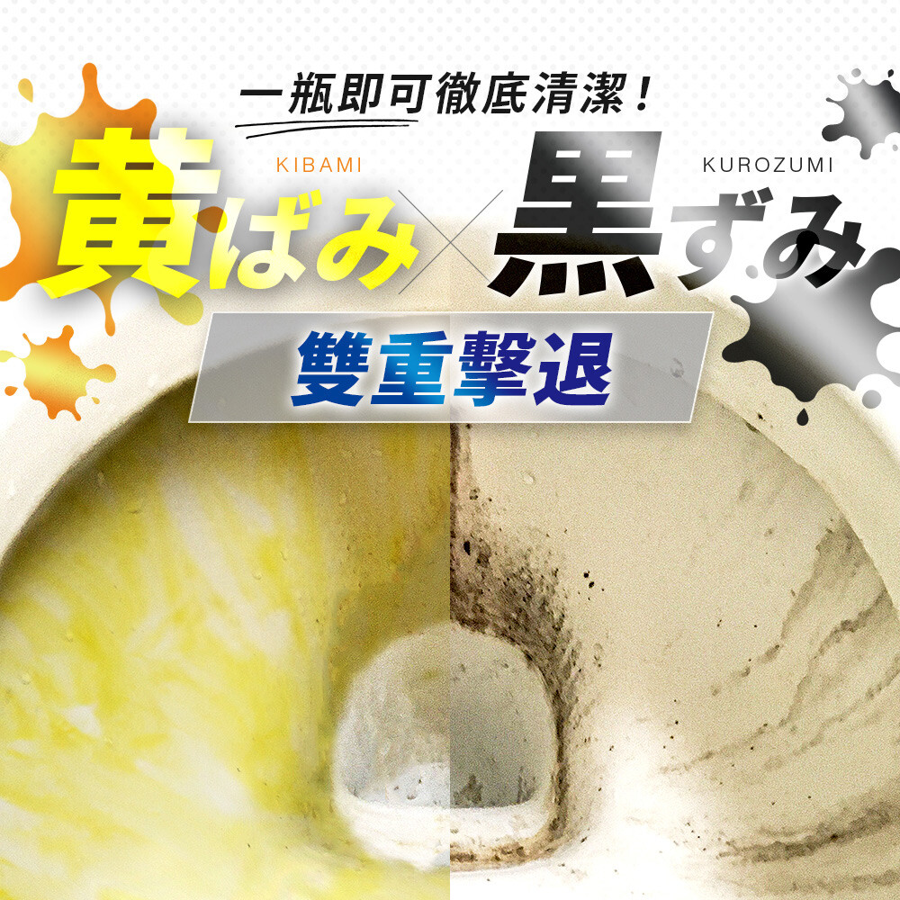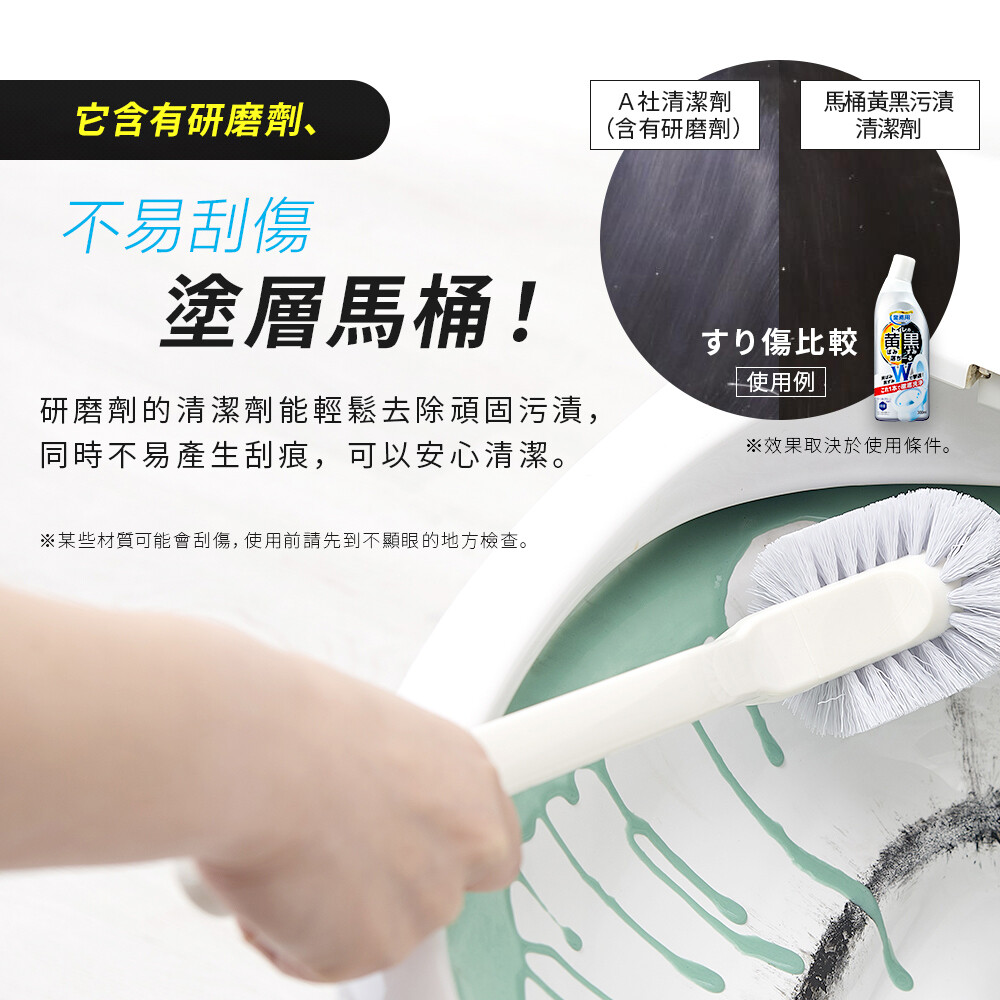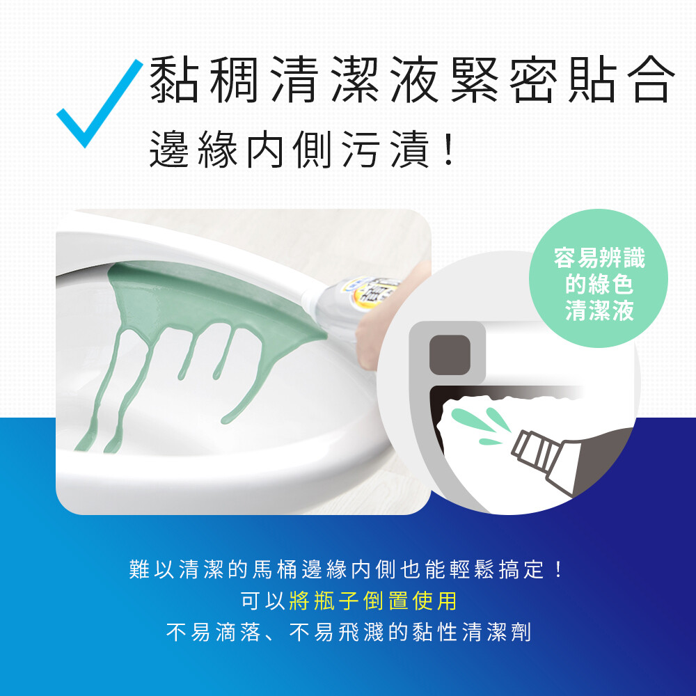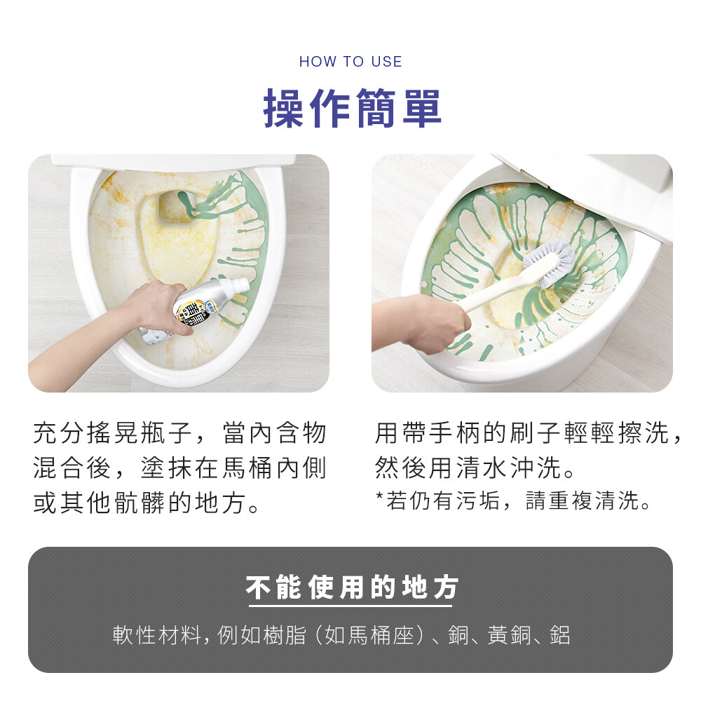 房屋清潔公司使用的專業廁所黄漬和黑漬清潔劑。含微粒子的清潔液,徹底刮除污漬!僅需一瓶,雙重攻擊黄漬和黑漬!低滴落、低飛濺的黏稠型。綠色清潔液便於觀察噴灑位置。清新花綠香。