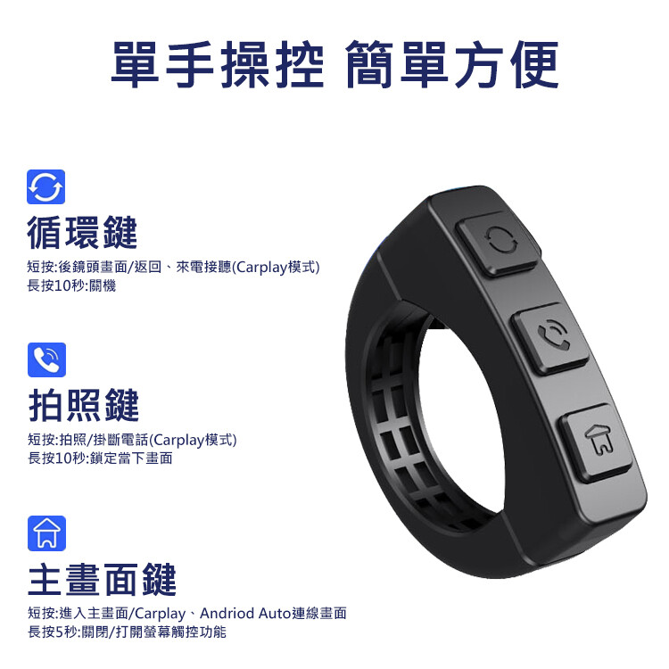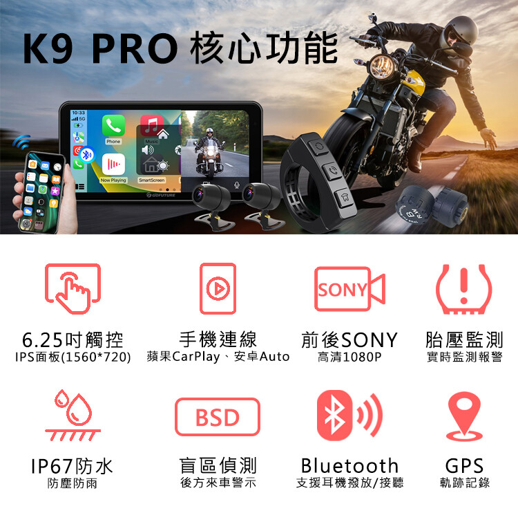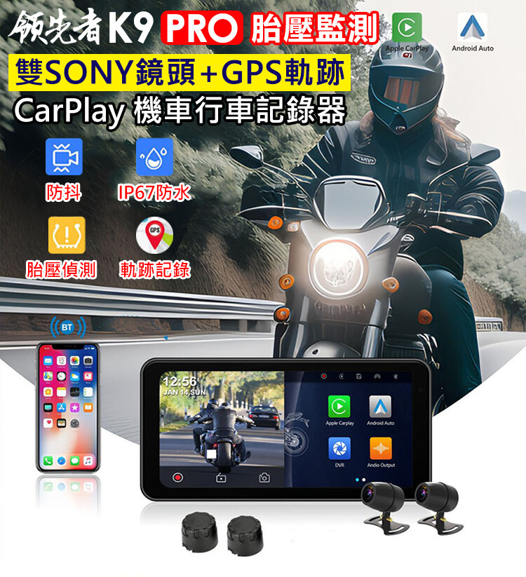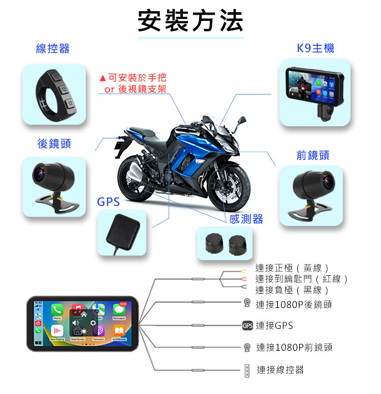 .商品內容:主機X1、前鏡頭線組X1、後鏡頭線組X1、線控器組X1、ACC降壓線X1、GPS組、胎壓組(感測器X2、扳手X1、螺母X2)、固定支架組X1(矽膠軟墊28mmX2、25.4mmX2、22mmX2、六角扳手X3、螺絲X3)、說明書X1