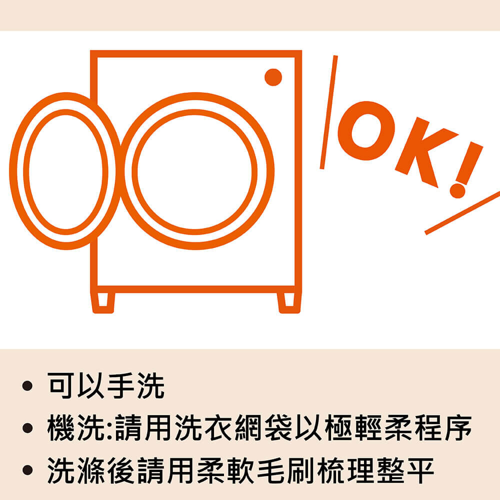 洗滌方式:手洗或機洗/溫和洗滌程序/水溫低於攝氏40度/中性洗劑/勿漂白/勿烘乾/勿熨燙/陰涼處懸掛晾乾/乾洗溫和程序