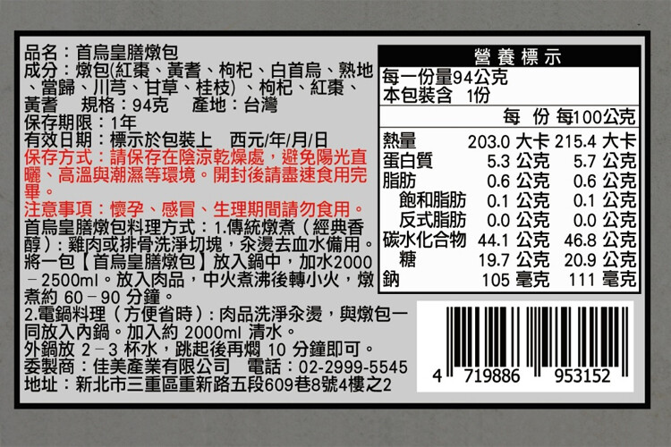 成份 : 燉包(紅棗、黃耆、枸杞、白首烏、熟地、當歸、川芎、甘草、桂枝) 、枸杞、紅棗、黃耆