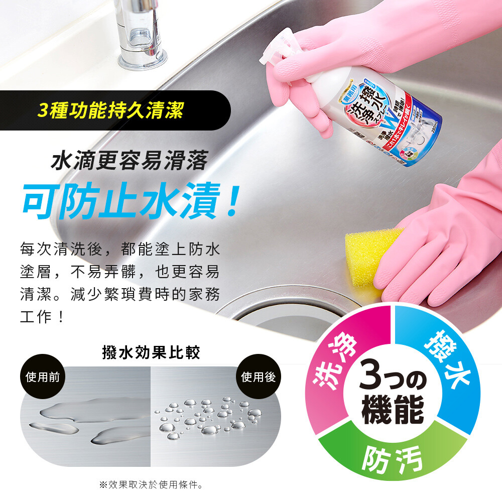 潑水塗層在清潔的同時也能潑水,讓水珠更容易滑落,防止水漬。適用於水槽、洗臉盆及水龍頭的快速清潔。