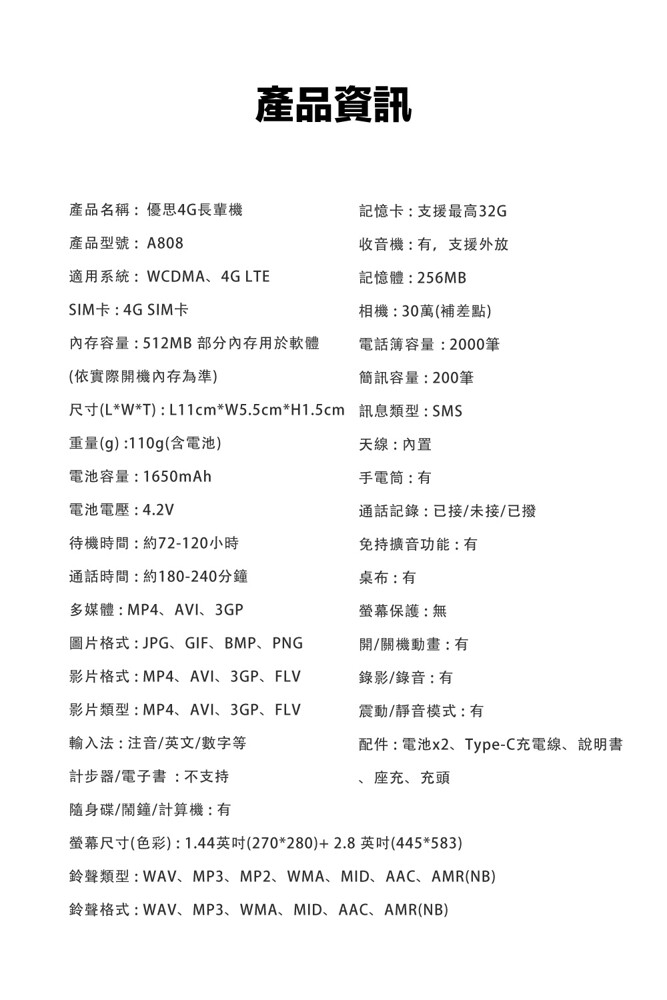 配件:原廠手機*1、原廠電池(1650mAh)*2、座旅二合一充電器*1、USB傳輸線*1、使用說明書*1