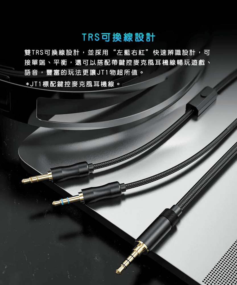 TRS可換線設計 | 雙TRS可換線設計,並採用“左藍右紅”快速辨識設計,可接單端、平衡,還可以搭配帶鍵控麥克風耳機線暢玩遊戲,豐富的玩法更讓JT1物超所值。