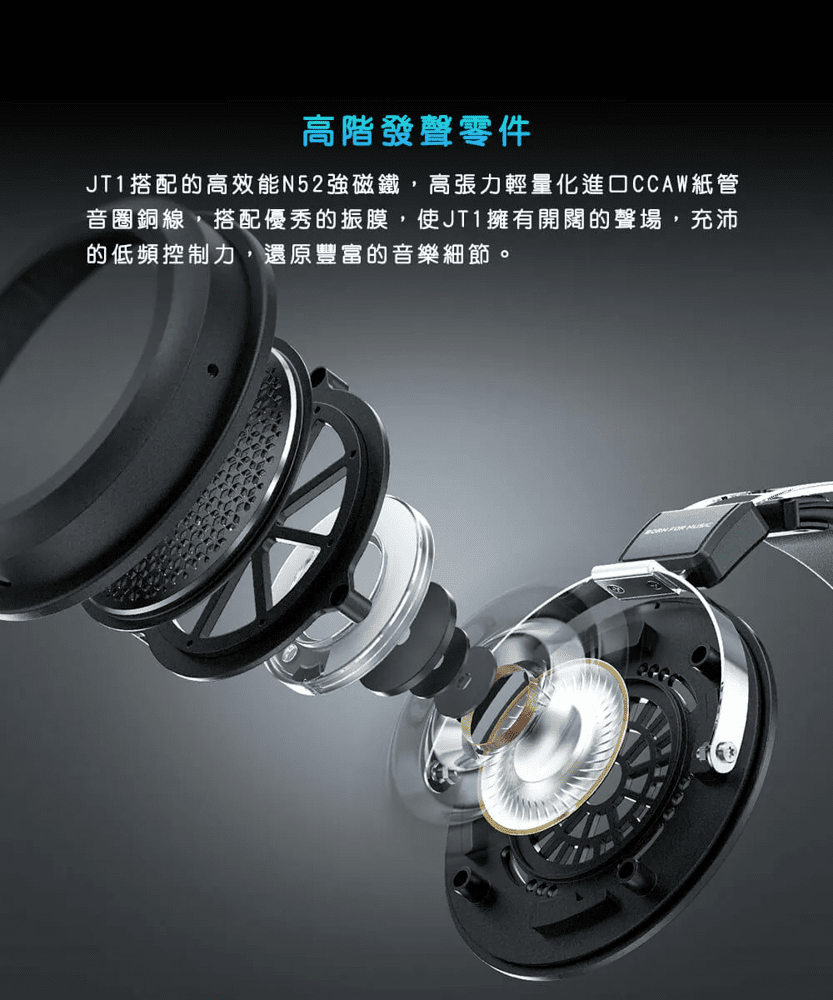 N52高效能磁體 | 搭配的高效能N52強磁鐵,高張力輕量化進口CCAW紙管音圈銅線,搭配優秀的振膜,使JT1擁有開闊的聲場,充沛的低頻控制力,還原豐富的音樂細節。