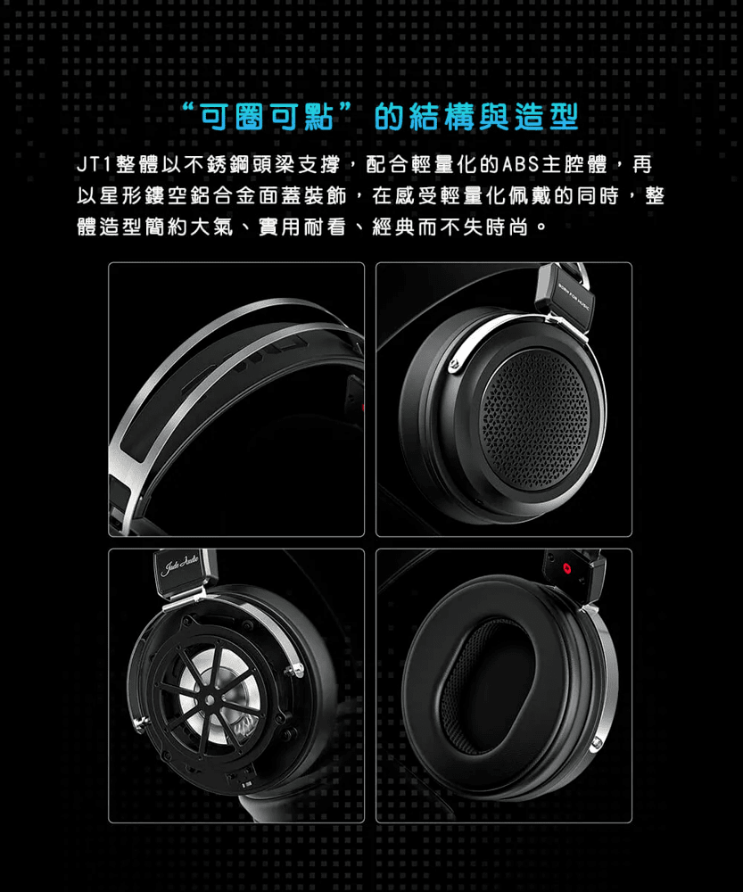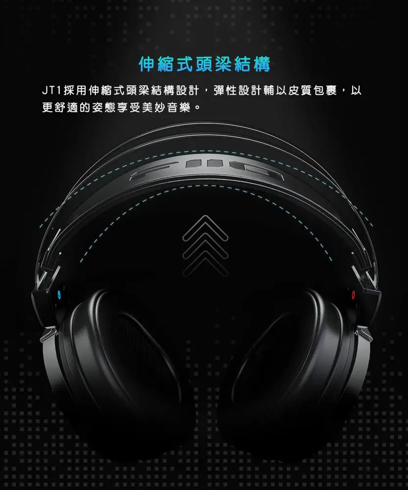伸縮式頭梁結構 | JT1採用伸縮式頭梁結構設計,整體以不銹鋼頭梁支撐,配合輕量化的ABS主腔體,再以星形鏤空鋁合金面蓋裝飾,整體造型簡約大氣,並使用彈性設計輔以皮質包裹,以更舒適的姿態享受美妙的音樂。