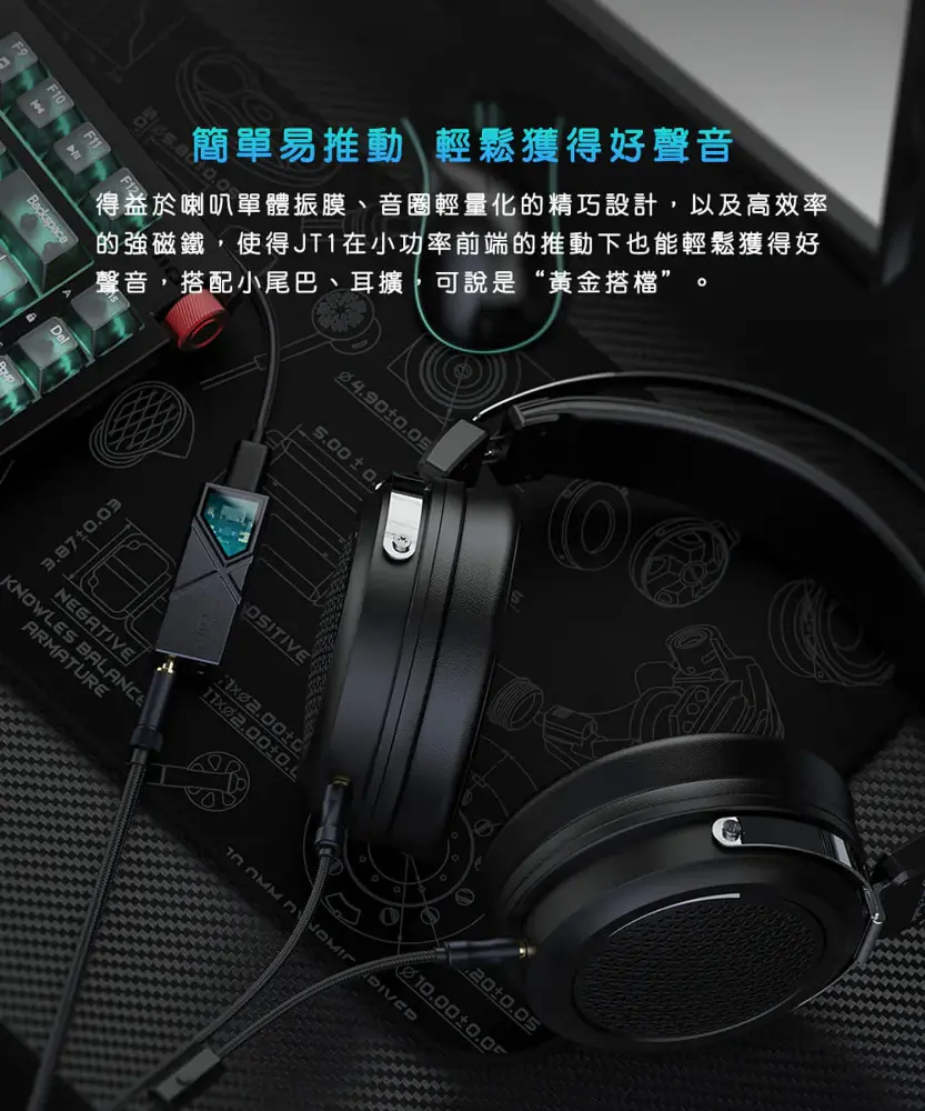 簡單易推動 | 得益於喇叭單體振膜、音圈輕量化的精巧設計,以及高效率的強磁鐵,使得JT1在小功率前端的推動下也能輕鬆獲得好聲音,搭配小尾巴、耳擴,可說是“黃金搭檔”。