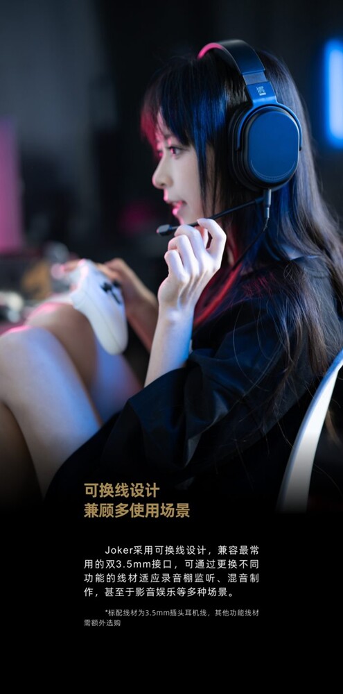 Joker採用可換線設計,兼容最常用的雙3.5mm接口,可通過更換不同功能的線材適應錄音棚監聽、混音製作,甚至於影音娛樂等多種場景。