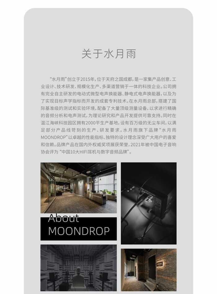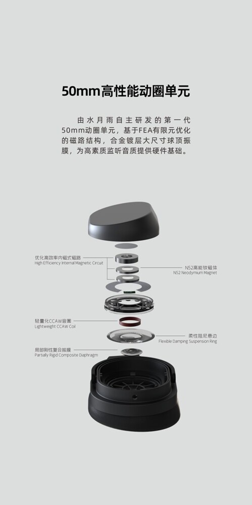 由水月雨自主研發的第一代50mm動圈單元,基於FEA有限元優化的磁路結構,合金鍍層大尺寸球頂振膜,為高素質監聽音質提供硬件基礎。