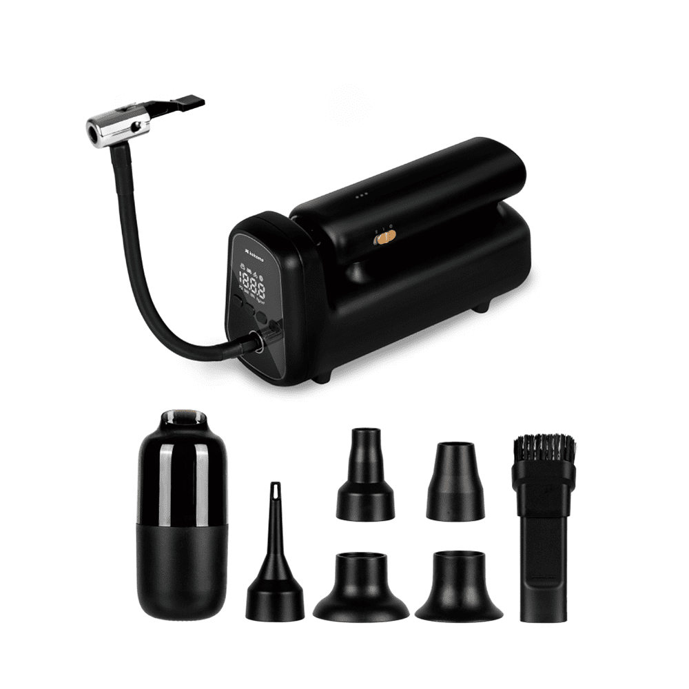 配件:主機x1、充氣泵x1、吸塵器x1 高壓氣管x1、法式氣嘴x1、氣墊銅嘴x1、泳圈銅嘴x1、球針x1 毛刷吸嘴x1、吹氣轉換頭x1、吸氣轉換頭x1、小口徑吹吸頭x1、中口徑吹吸頭x1、大口徑吹吸頭x1、2A數據線x1、保護套x2、收納袋x1、說明書x1、保固書x1