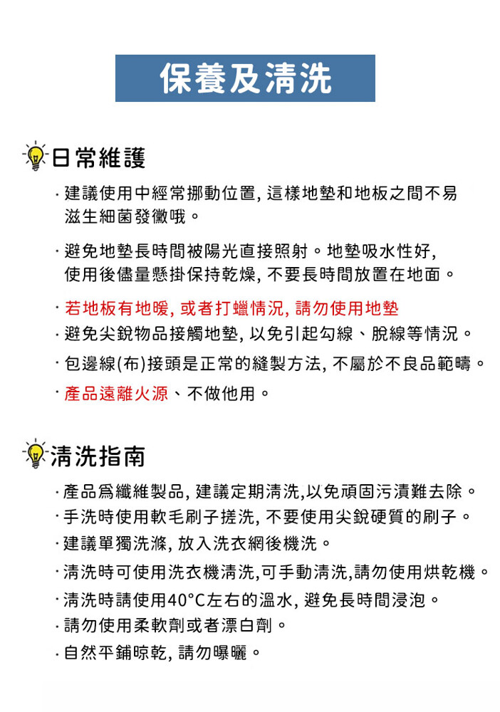 3.若地板有地暖,或者打蠟情況,請勿使用地墊