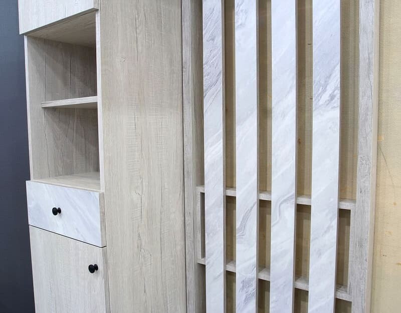 | 材質 | 板材 : 桶身 , 門片及內部隔板皆為木心板材 塗裝 : 白梣色耐磨木皮+仿石紋皮 , 右下座櫃檯面附包布坐墊 五金 : 內建一抽採鋼珠滑軌 , 黑鐵把手 , 門片緩衝後鈕 , 12cm高黑鐵腳座 , 右邊屏風附六個掛勾可鎖 |