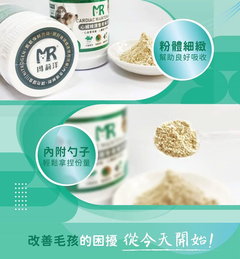 ※因應各地區包裝設計之法規規範不同,瑪莉洋寵物營養粉系列已經將包裝設計調整為符合各地區法規之專有包裝。為保障消費者之權益,請消費者選購官方授權之代理商/店家通路,安心選購瑪莉洋系列產品。