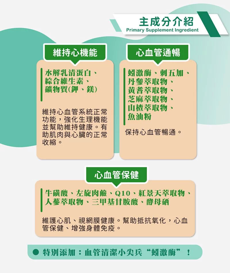 產品說明:本產品能補充心臟功能所需要的營養成分。可做為心血管疾病的營養補充。