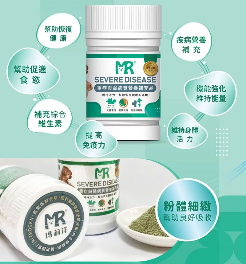 產品說明:含多種寵物必須營養素,維持身體應有抵抗力。針對虛弱、惡病質、重大傷病治療期營養補充品,幫助恢復健康。