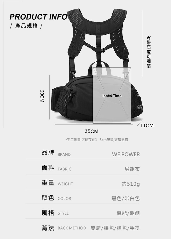 ◆一包多用,雙肩/腰包/胸包/手提,適用各種場景