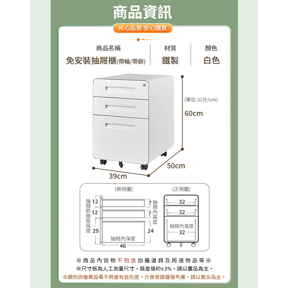 品牌AOTTO型號AC-703W顏色白色產地中國特點附輪、耐重、防塵材質金屬類型收納櫃款式抽屜式、附輪式適用場所臥室、客廳、辦公室層數3層組裝方式免組裝尺寸長度: 50cm 寬度: 39cm 高度: 60cm