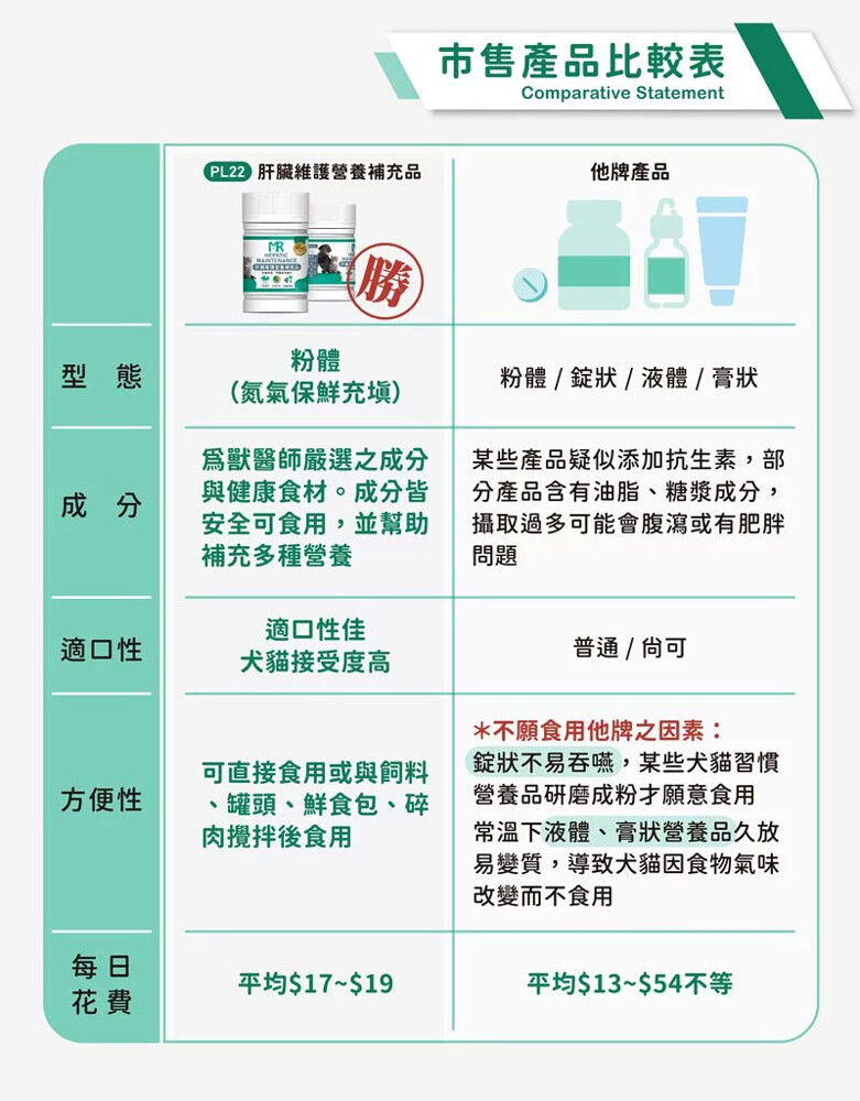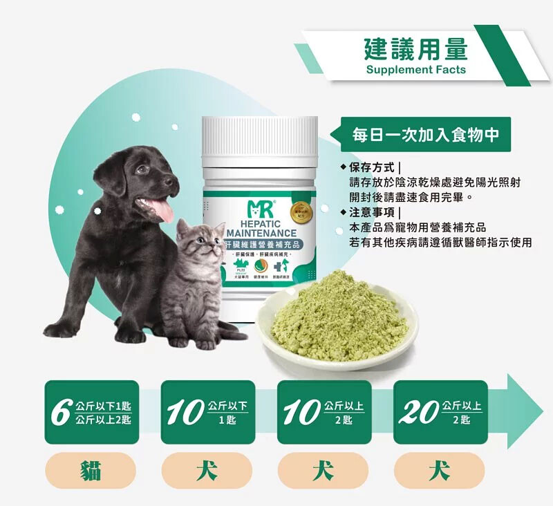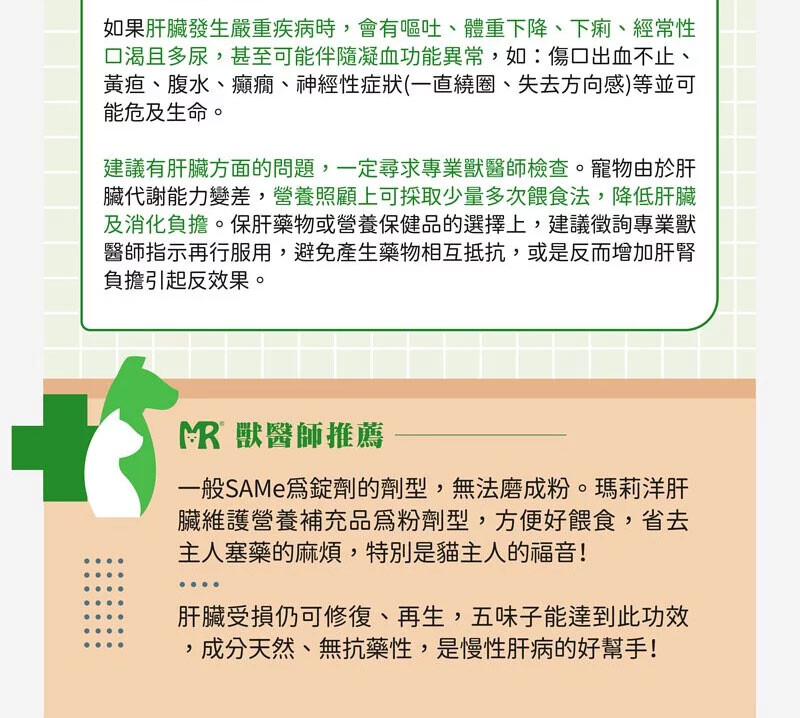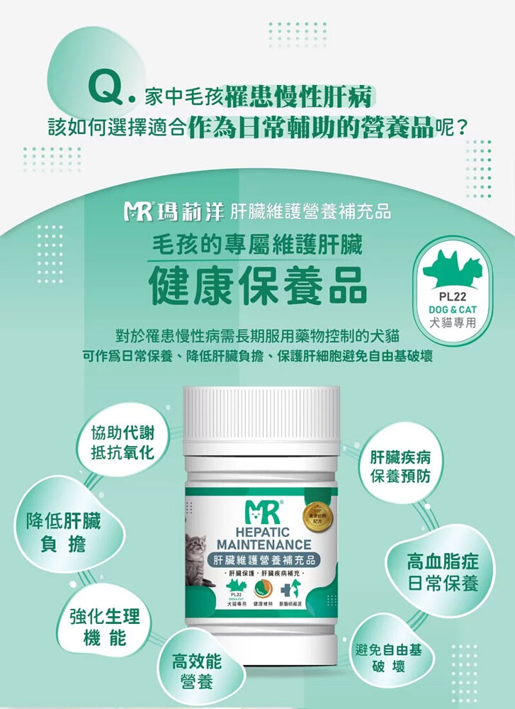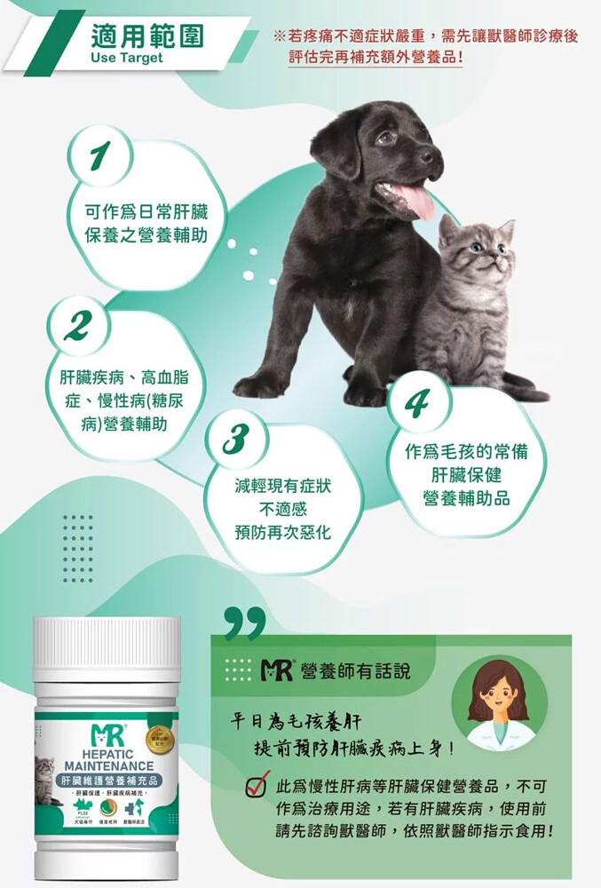 可做為平日及罹患肝病犬貓輔助治療保健營養品。對於罹患慢性病需長期服用藥物控制的犬貓,可搭配使用本產品來降低肝臟負擔。保護肝細胞避免自由基破壞。