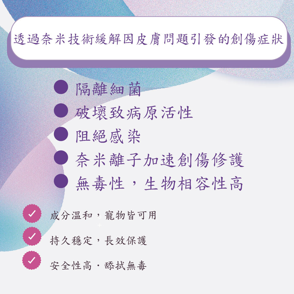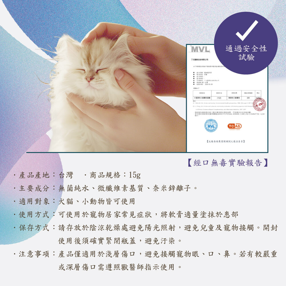 有效保護傷口、緩解皮膚刺激、成分溫和、舔食無礙,寵物能安心使用!