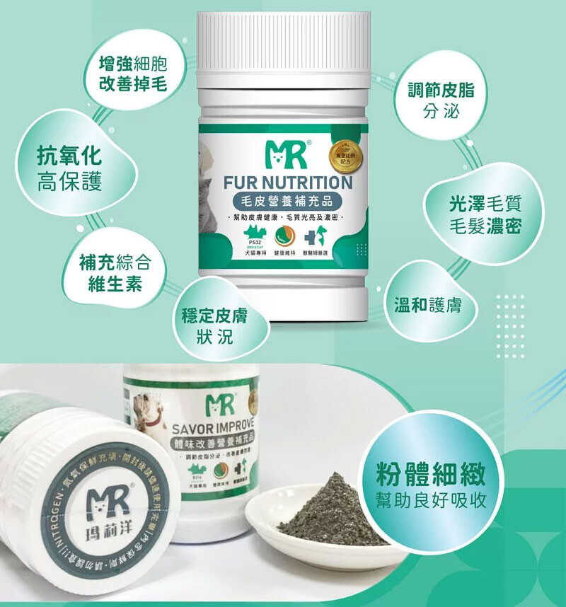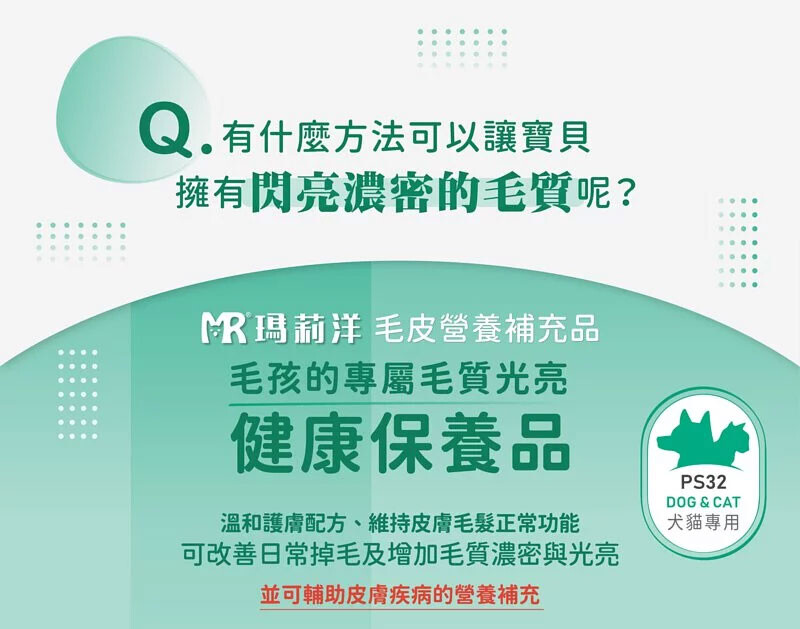 瑪莉洋針對犬貓皮膚以及毛髮各推出毛皮營養、體味改善營養補充品,兩者可以一起服用,相輔相成。