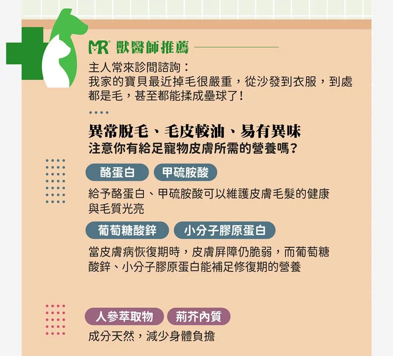 產品說明:溫和護膚配方,可維持皮膚毛髮正常功能,改善日常掉毛,並可輔助皮膚疾病的營養補充。