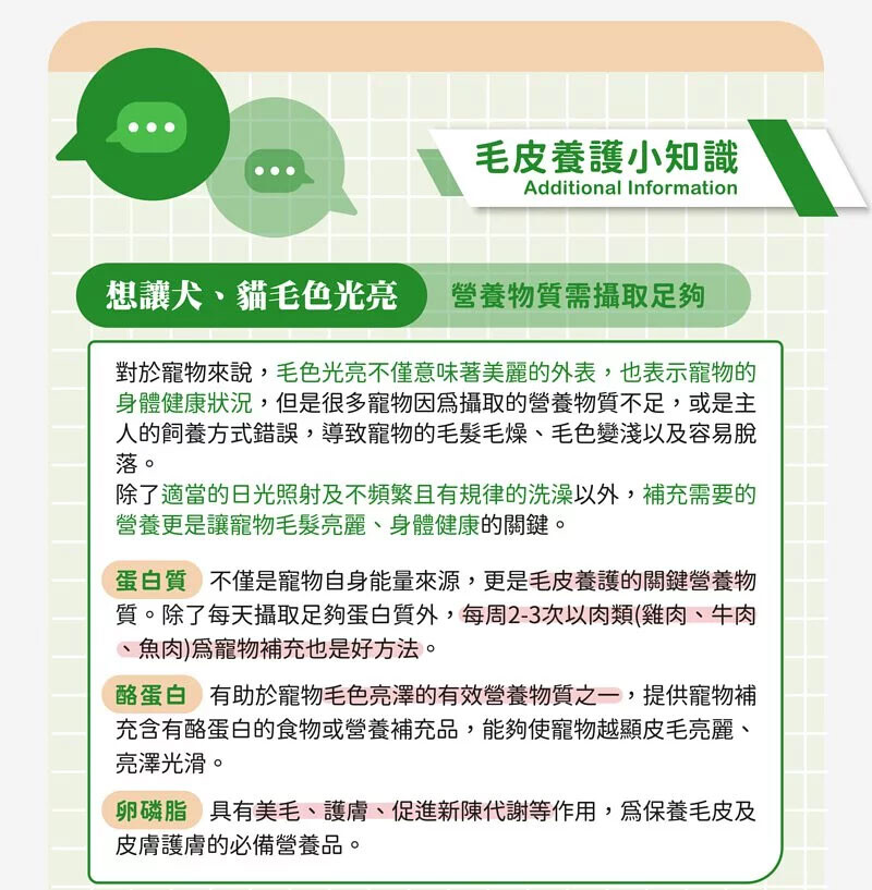蛋白質-蛋白質不僅是寵物自身能量來源,更是皮毛養護的關鍵營養物質,除了每天攝取足夠的蛋白質之外,可以以每周2-3次以肉類(雞肉、牛肉、魚肉)為寵物進行營養補充。