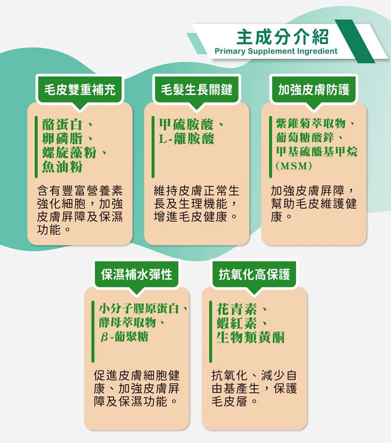 產品特色:幫助皮膚健康、毛髮濃密及光亮