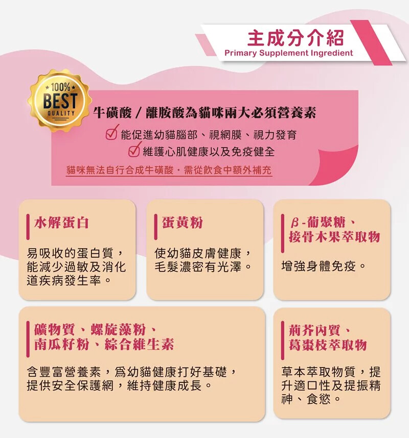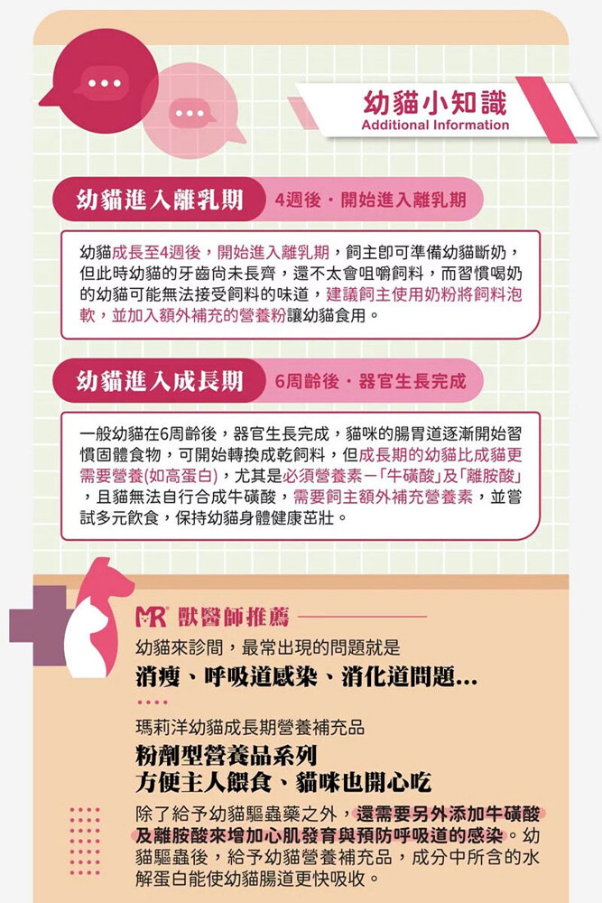 產品說明:提供幼貓成長需要的營養素,增強免疫力,以及維護呼吸道系統健康。