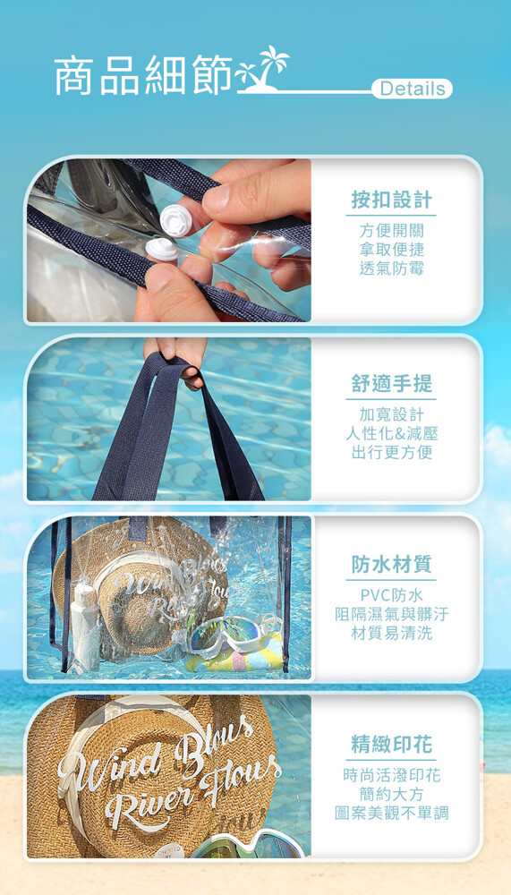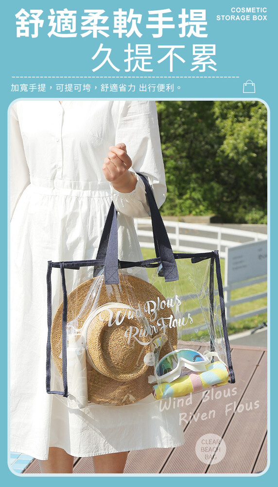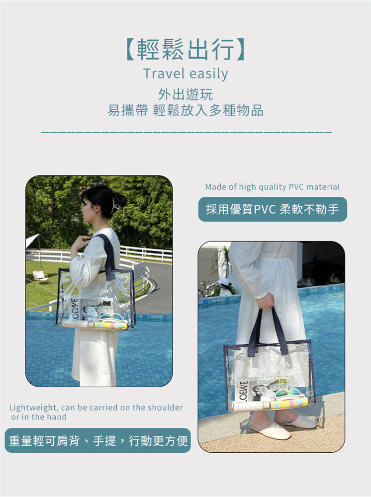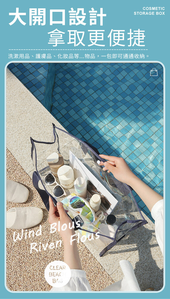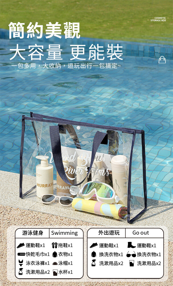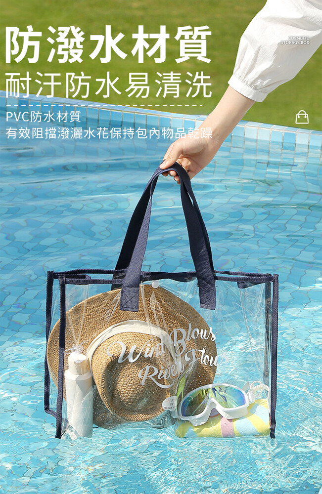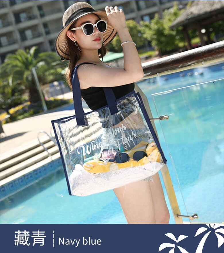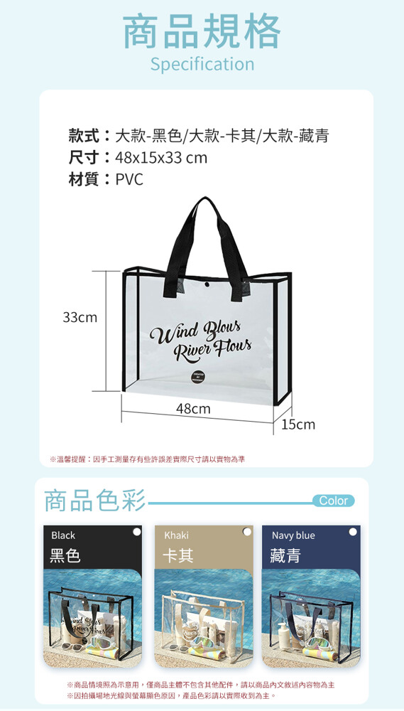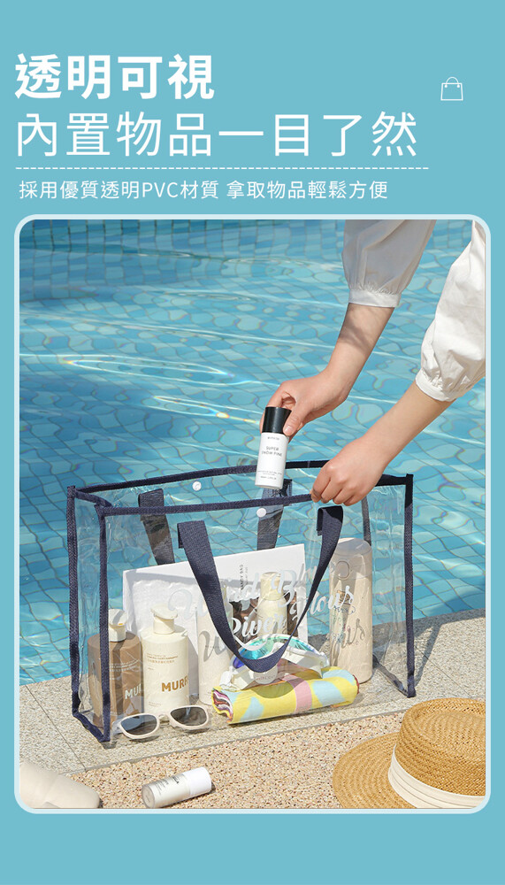 韓系大容量防水透明沙灘游泳包 ★透明可視,一目瞭然 ★防水防潮,耐髒易清潔 ★大開口設計,拿取便利 ★輕巧可折疊,攜帶便利 款式:大款-黑色/大款-卡其/大款-藏青(透明易清潔 折疊好攜帶) 商品尺寸:48x15x33cm 材質:PVC