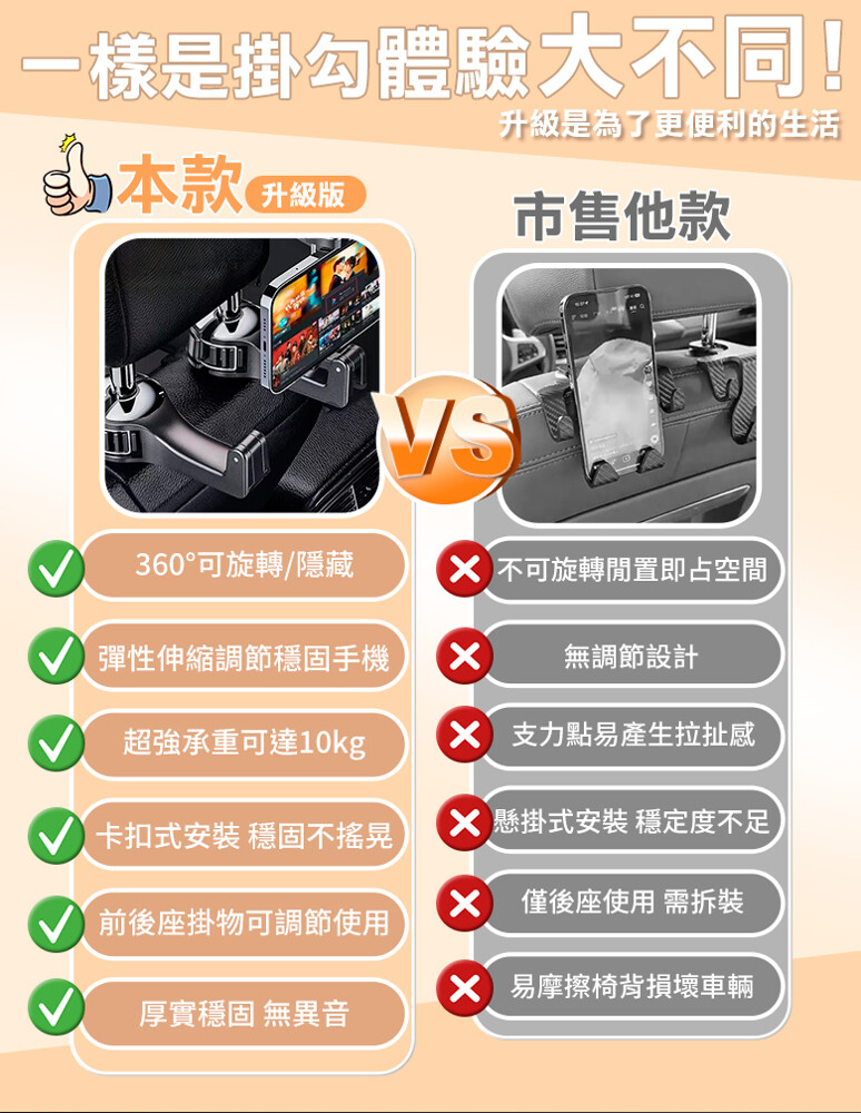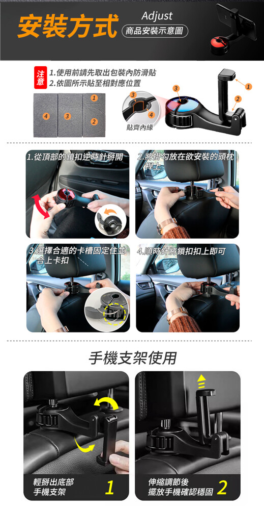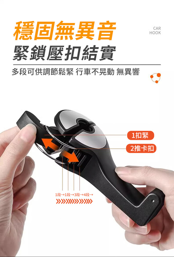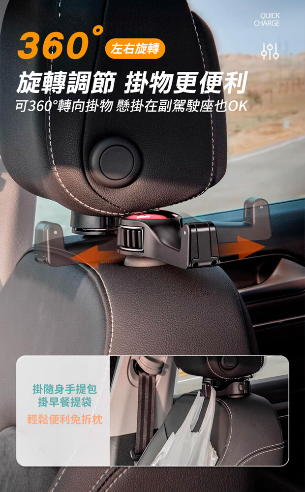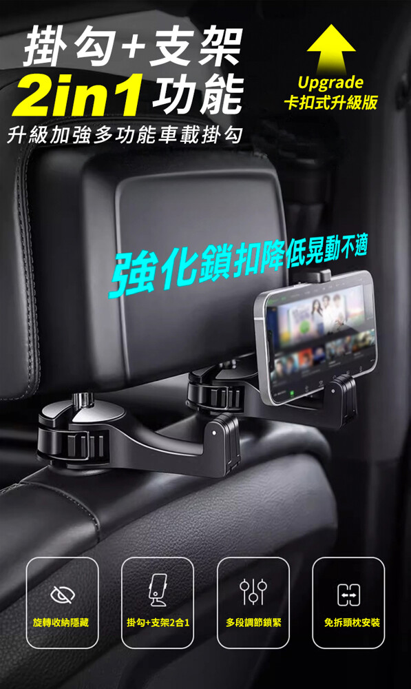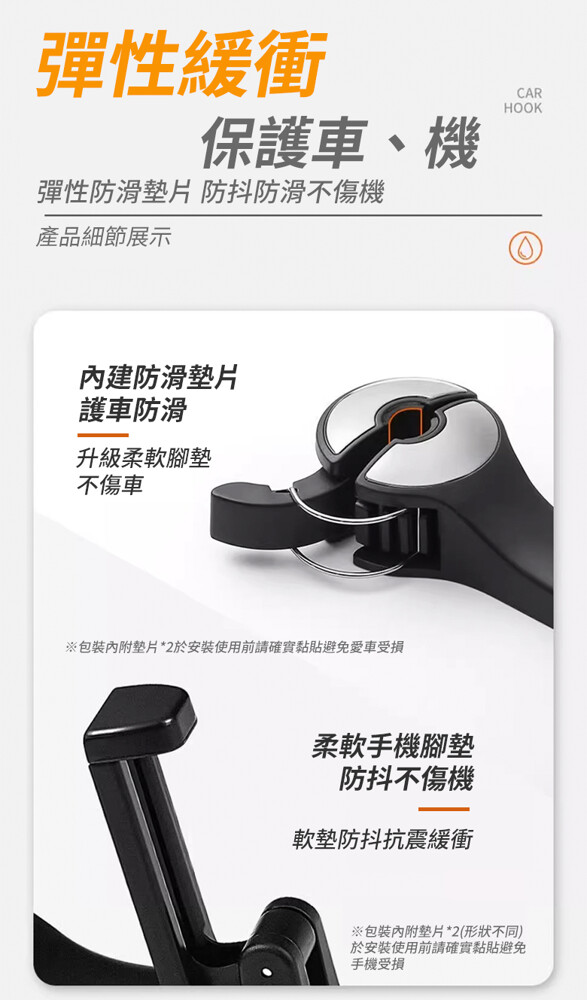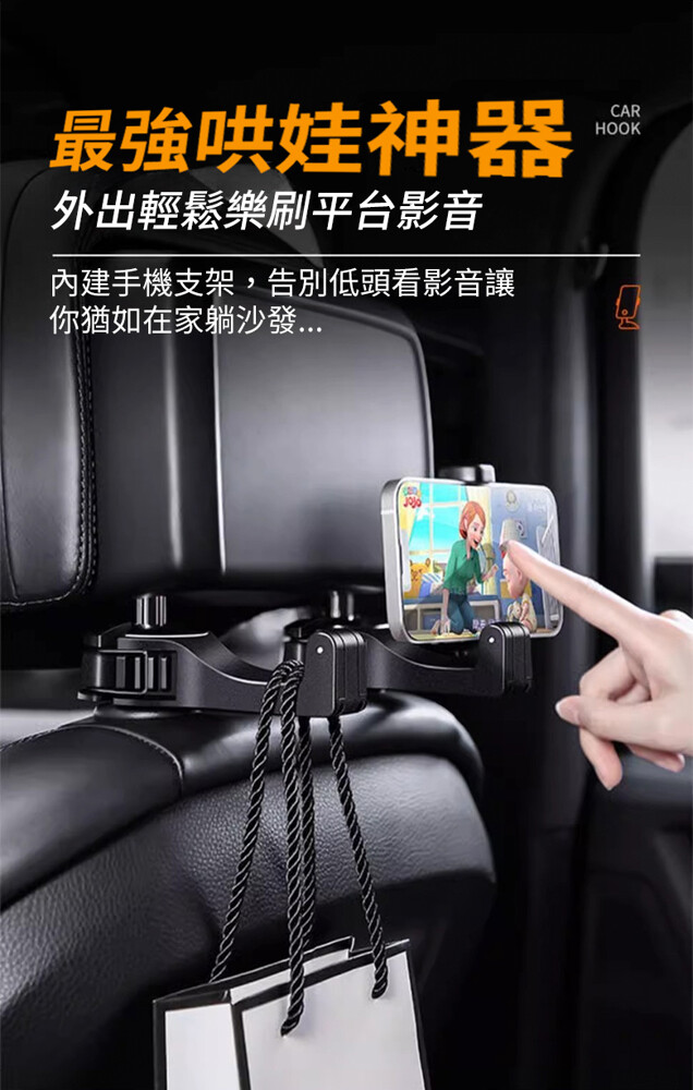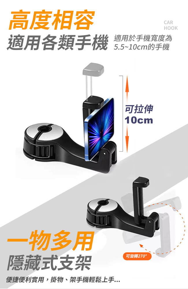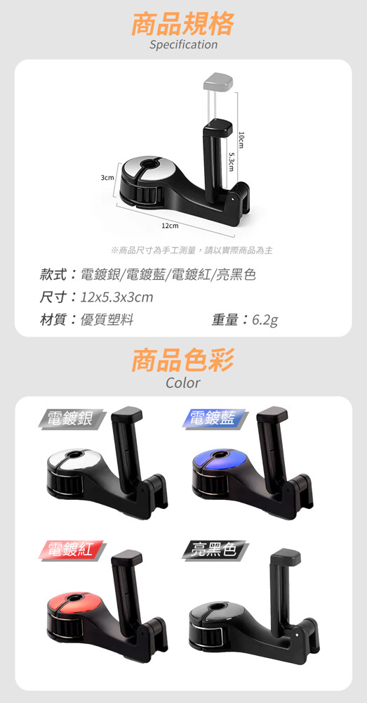 360°萬向可調車用掛勾手機架 ★穩固掛勾,耐重20公斤 ★二合一設計掛勾+手機支架 ★快速好安裝,旋轉隱藏收納 ★多段調節,適用各種車型 款式 : 電鍍銀/電鍍藍/電鍍紅/亮黑(升級款多段可調鬆緊) 尺寸 : 12x5.5x3cm 材質 : 優質塑料