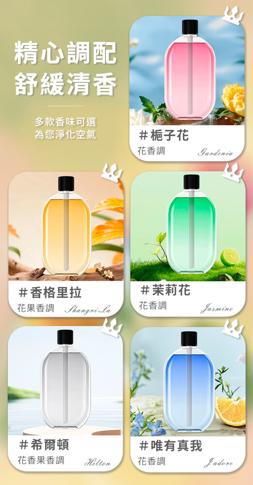 精油款式:香格里拉(花果香調)/茉莉花香(花香調)/梔子花(花香調)/唯有真我(花香調)/希爾頓(花香調)