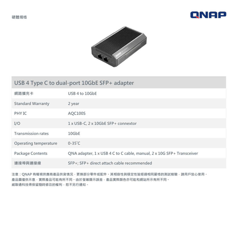 Package Contents QNA adapter, 1 x USB 4 C to C cable, manual, 2 x 10G SFP+ Transceiver