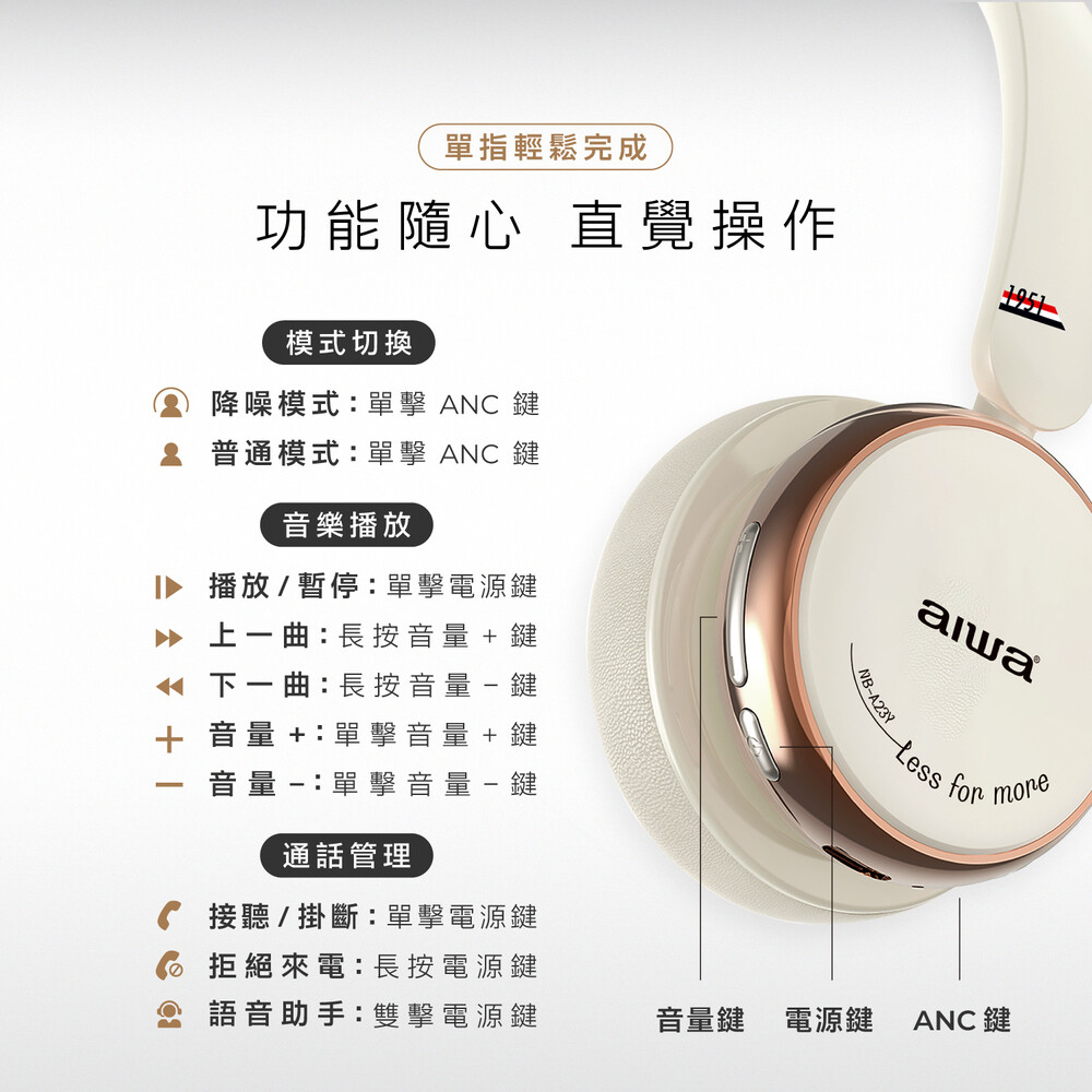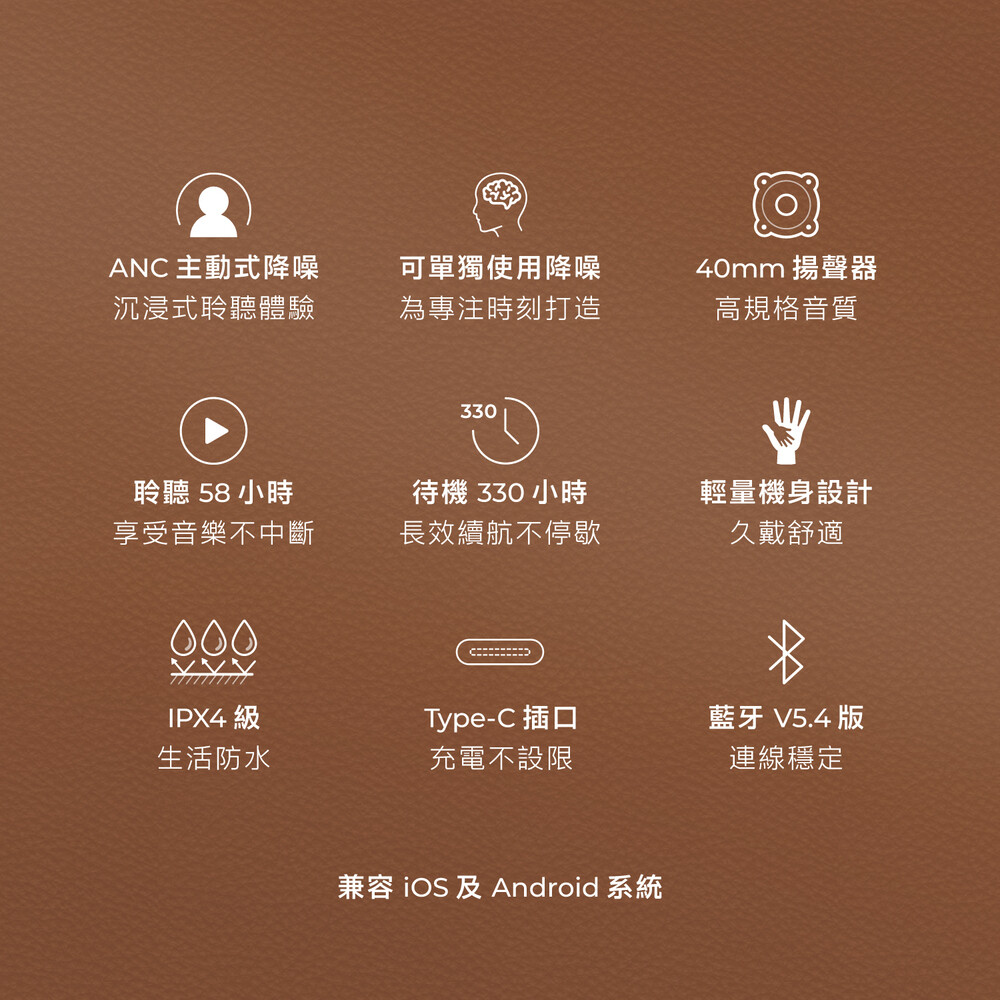 .ANC主動式降噪 .40mm 大單元揚聲器,聲場開闊 .播放/通話時間約58小時 .耳罩可旋轉設計,方便收納 .優質仿蛋白橢圓型隔音耳罩 .高彈海綿, 觸感順滑細膩舒適 .160g機身輕量設計,久戴不累 .兼容iOS及Android系統