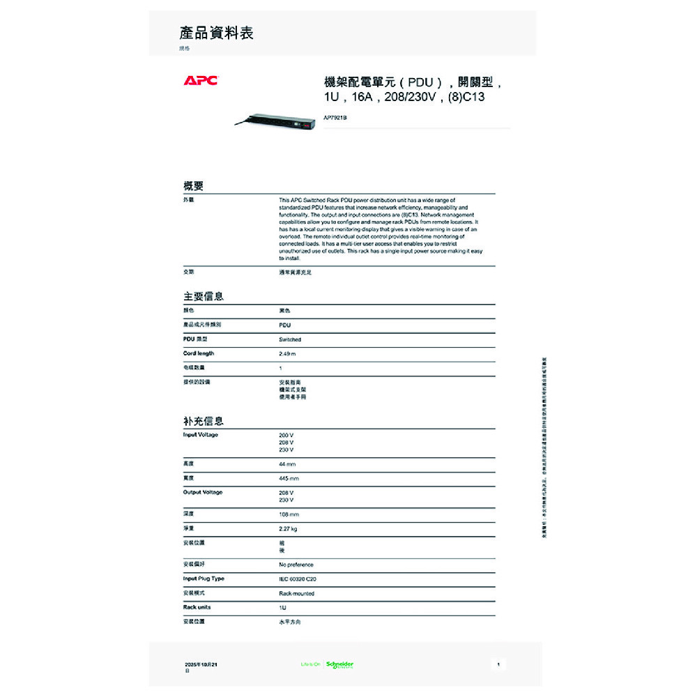 標稱輸出電壓 208V, 230V