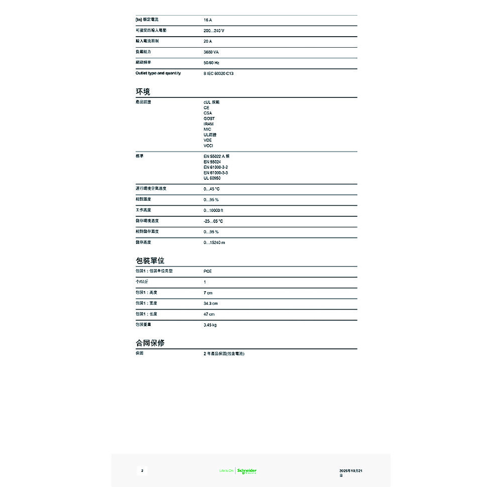 承載能力 3680伏特安培 (VA)