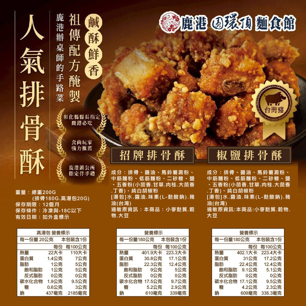 成分:排骨、醬油、馬鈴薯澱粉、中筋麵粉、低筋麵粉、二砂糖、鹽、五香粉(小茴香、甘草、肉桂、大茴香、丁香)、純白胡椒粉