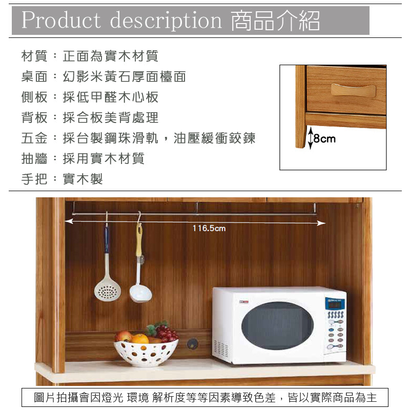 五金:採台製鋼珠滑軌,油壓緩衝鉸鍊