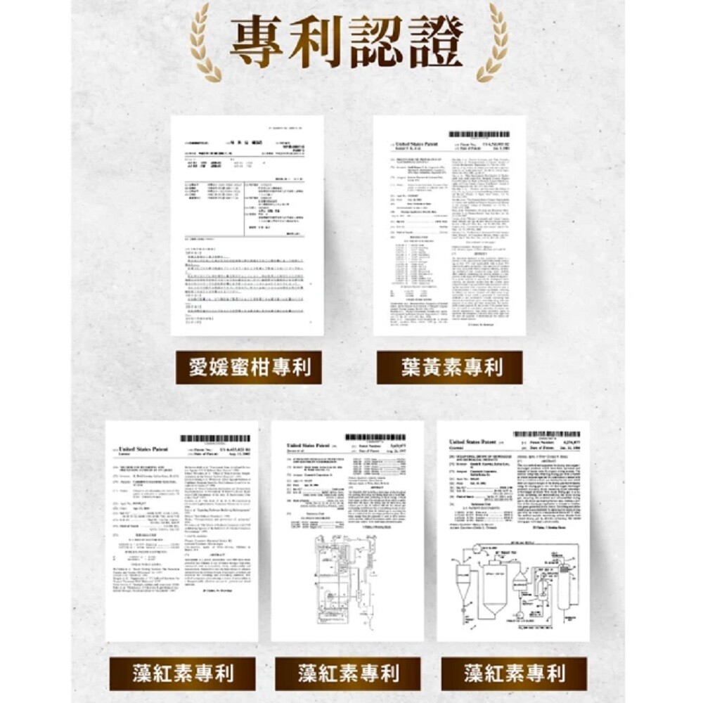 4.內容物成分(如含有豬、牛成分請加註國別):木鱉果提取物、金盞花萃取物 (麥芽糊精、金盞花萃取物(含游離型葉黃素))、(黃金麥角胜(金頂側耳萃取物、刺芹側耳萃取物)、酵母發酵物(含SAM-e)、蕎麥苗粉(含亞精胺))、溫州蜜柑粉、金盞花萃取物 (麥芽糊精、金盞花萃取物(含玉米黃素))、紅藻萃取物(辛烯基丁二酸鈉澱粉、紅藻萃取物(含藻紅素)、二氧化矽)、智利酒果萃取物(智利酒果萃取物、麥芽糊精)、二氧化矽、黑豆皮抽出物、流行鏈球菌發酵物(含透明質酸鈉) 、山桑子萃取物。