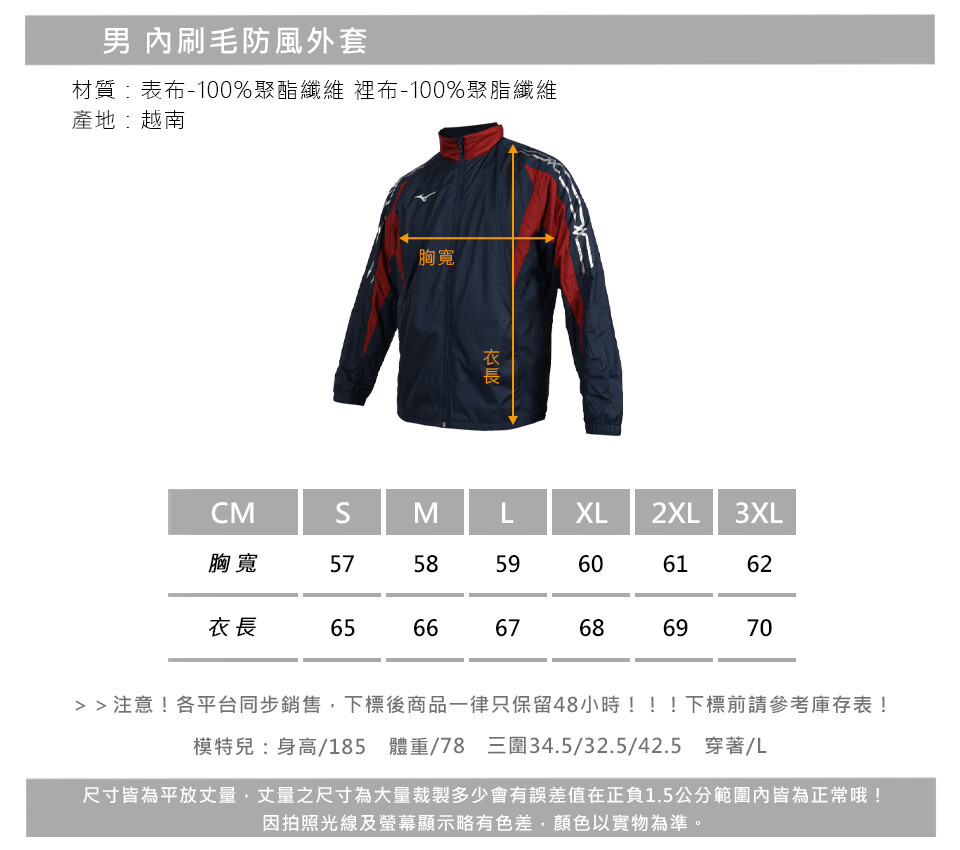 MIZUNO 男內刷毛防風外套-防潑水 運動 上衣 休閒 丈青白紅