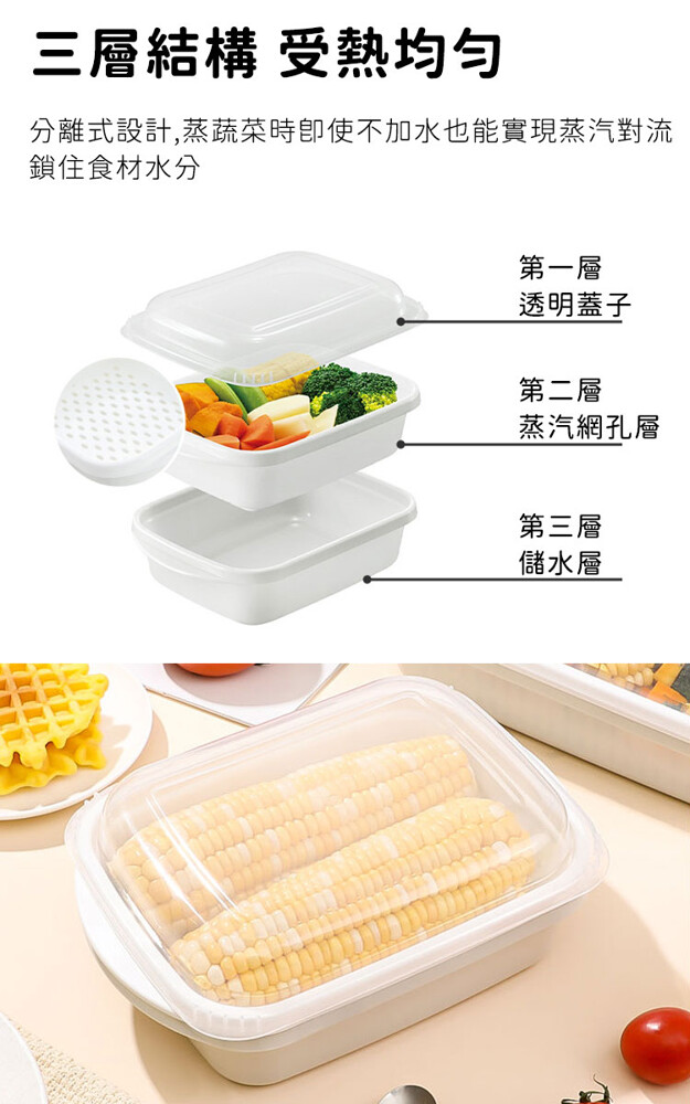 食材加水:蔬菜等含水較多的食材,可淸洗後直接加熱;加熱饅頭、燒賣包子等冷凍品前,在底部加入2湯匙或少量冷水卽可。(避免加熱水使蒸汽大量聚集,導致蓋子過熱變形)