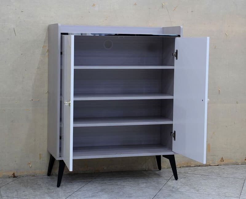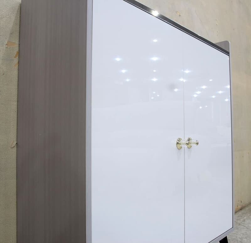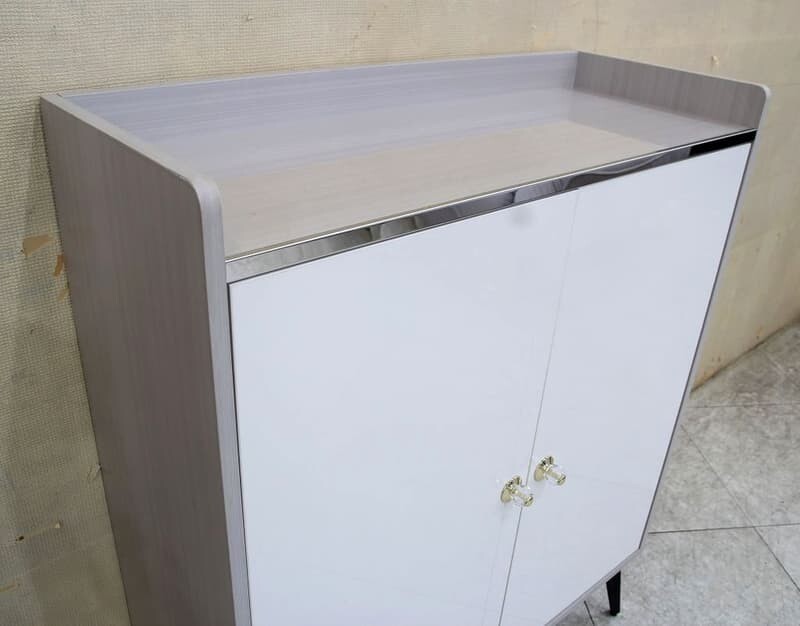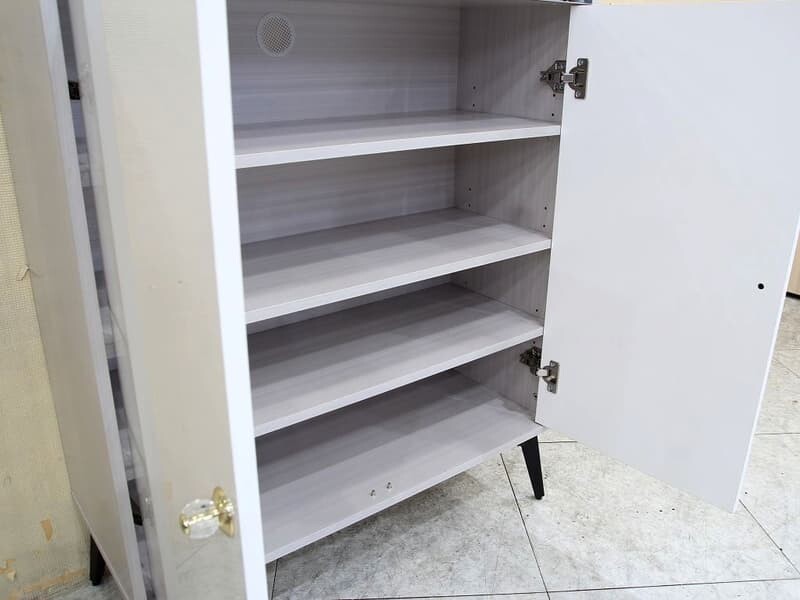 | 材質 | 板材 : 全包式MDF材質 塗裝 : 門片白色微亮面烤漆, 其餘灰色石紋木皮 , 圓弧做工質感細緻 五金 : 門片緩衝後鈕 , 造型把手 , 鍍鉻飾條點綴 ,17cm高黑鐵腳座,隔板可調高低 |