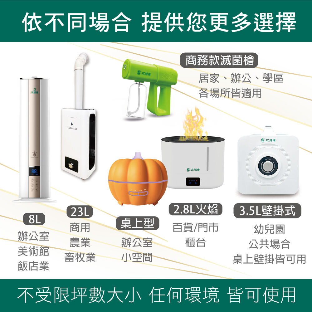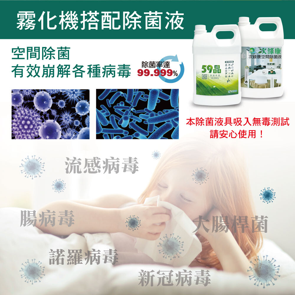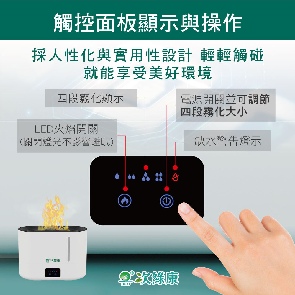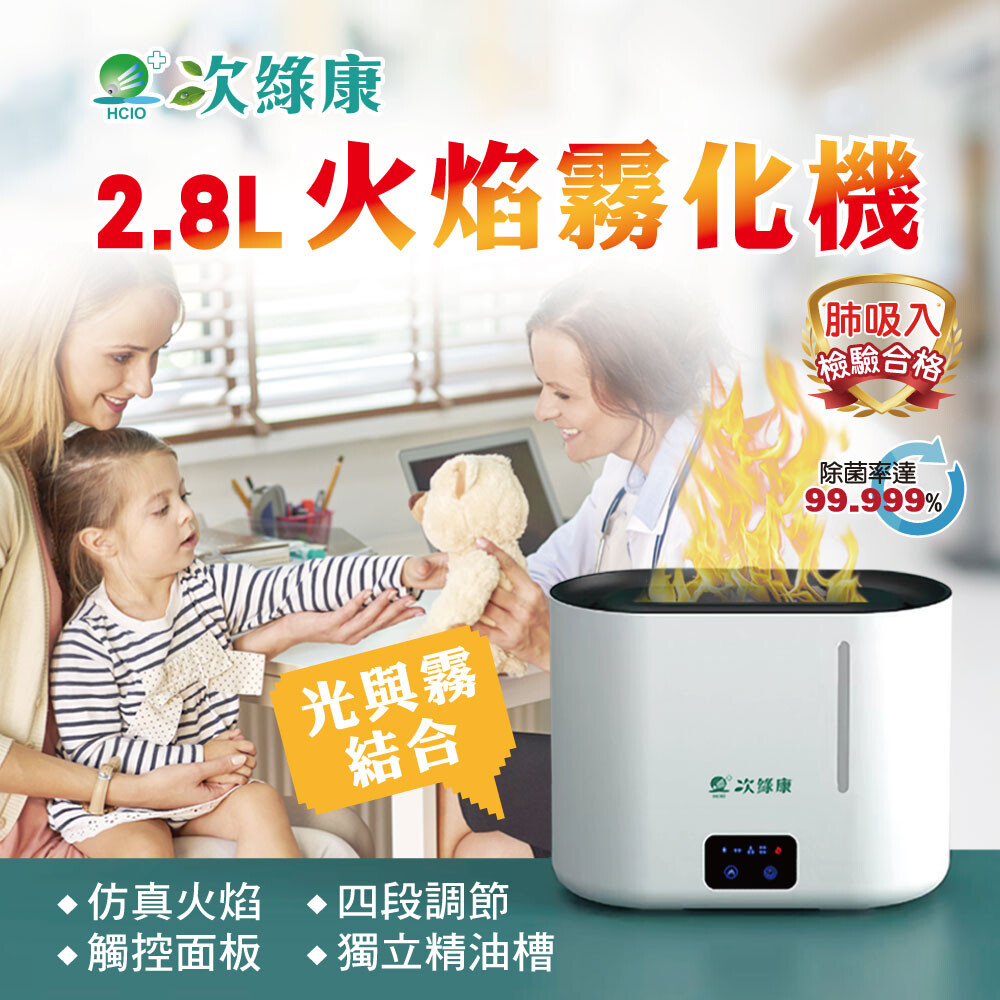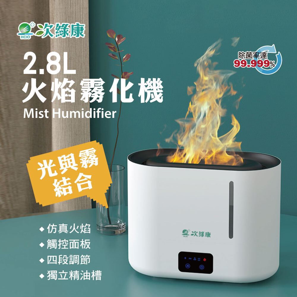 擁有次綠康 有效降低落菌數 細菌病毒通通OUT ✦LED火焰燈光 (可關閉火焰燈光不影響睡眠 ) ✦2.8L大容量 上蓋加水 ✦獨立精油槽 缺水自動斷電 ✦觸控式面板 4段調節 建議坪數20坪 59晶除菌液 ✦低刺激不過敏 可加在霧化機使用