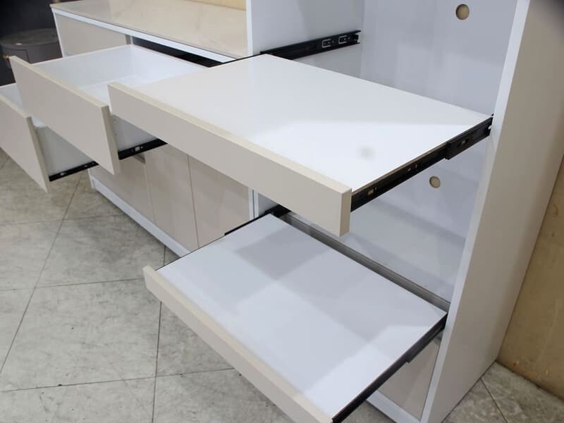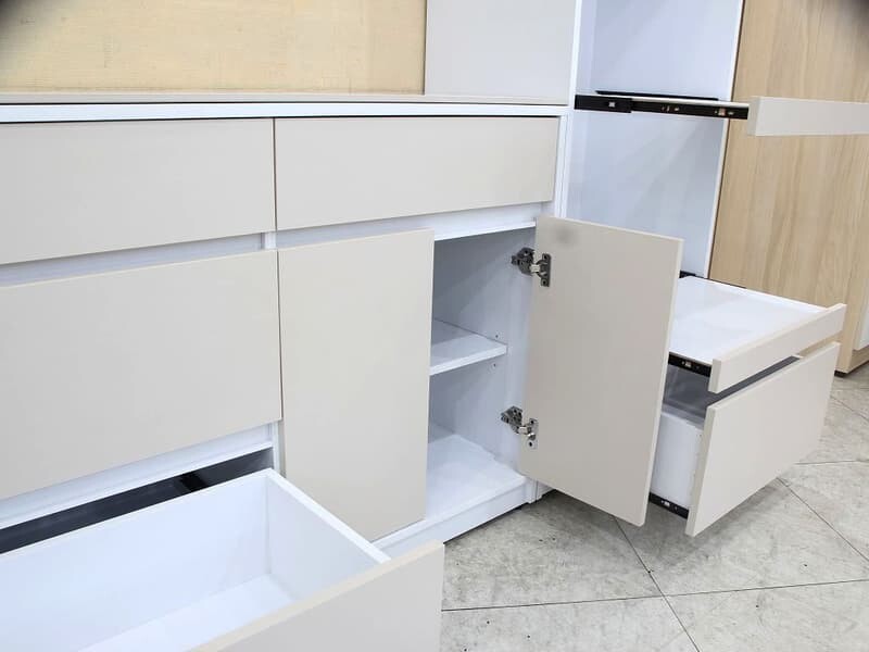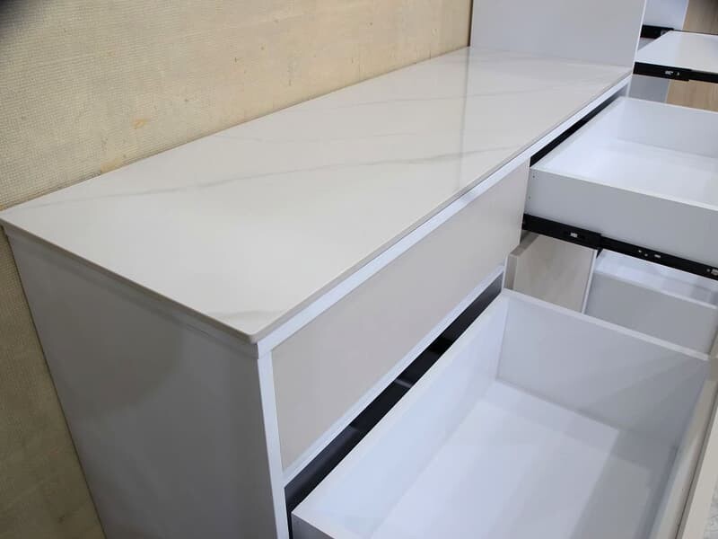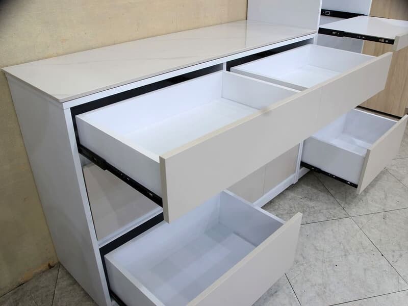 | 材質 | 板材 : 桶身,門板,抽牆及內部隔板皆為防潮木心板材,堅固耐用 塗裝 : 米色門片+白色桶身耐磨木皮,外部ABS封邊質感細緻 五金 : 全組雙截式鋼珠滑軌 ,門片緩衝後鈕,無把手設計簡潔優雅, 桌面附 10mm微亮面岩板 |