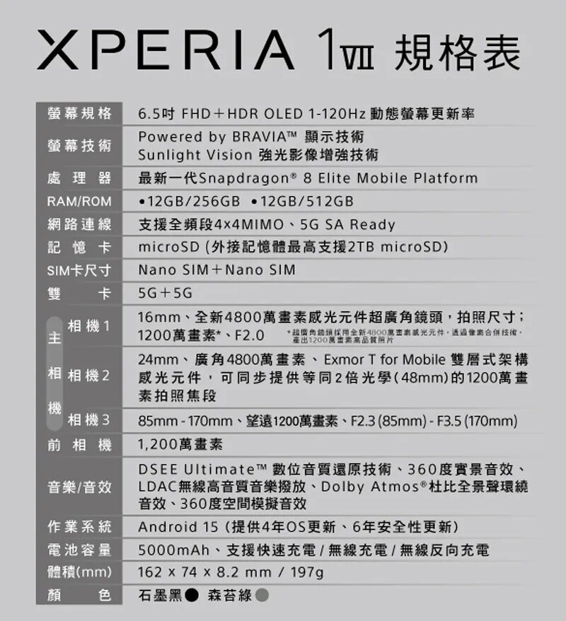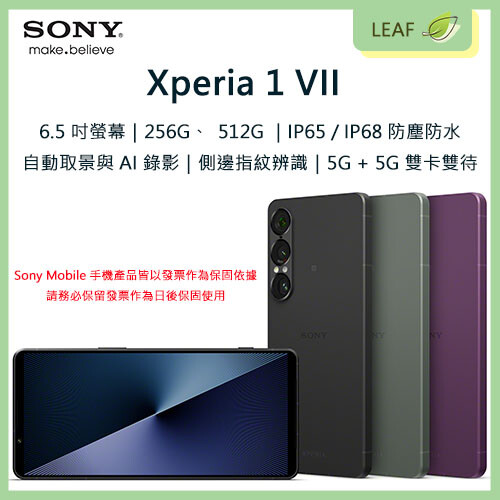 #公司貨 #索尼 #Sony #Xperia #1VII #6.5吋 #12G/256G #12G/512G #5G+5G雙卡雙待 #4800萬畫素雙鏡頭 #IP65/IP68防水塵 #側邊指紋辨識 #AI姿勢預測技術 #ZEISS T* 鍍膜 #智慧型手機