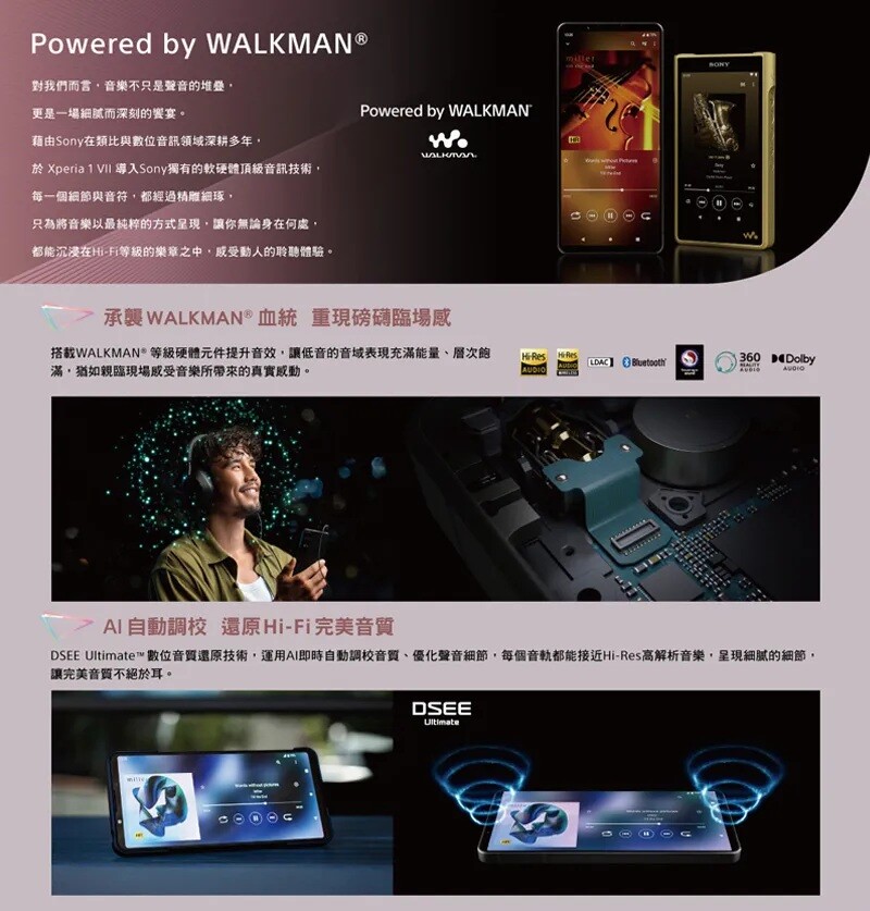 Sony Xperia 1 VII 搭載來自 Walkman 數位隨身聽的高品質發聲元件,首度在 3.5mm 耳機孔中導入「鍍金」材質,有效提升音訊傳導純淨度,帶來更細膩的聆聽體驗。雙立體聲揚聲器經過全面優化,強化中低音表現,打造更具臨場感的立體音效。此外,結合 AI 音訊強化技術,能細緻處理高頻細節,並支援 LDAC 無線高解析音質,即使使用藍牙耳機也能享有出色音質。