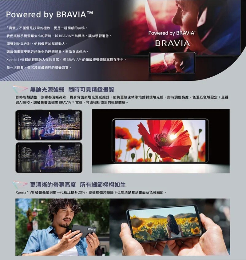 Sony Xperia 1 VII 配備 6.5 吋的 19.5:9 比例 FHD+ HDR OLED 螢幕,並支援 1 至 120Hz LTPO 動態更新率,兼顧流暢度與省電效能。螢幕搭載 Sunlight Vision 強光影像增強技術,以及由 Sony AI 驅動的 Powered by BRAVIA 顯示技術,展現與 BRAVIA 電視相近的高品質表現。結合前後雙光感元件,協助螢幕更精準的亮度及色彩調整,並在陽光直射環境下,依然能維持清晰可見。